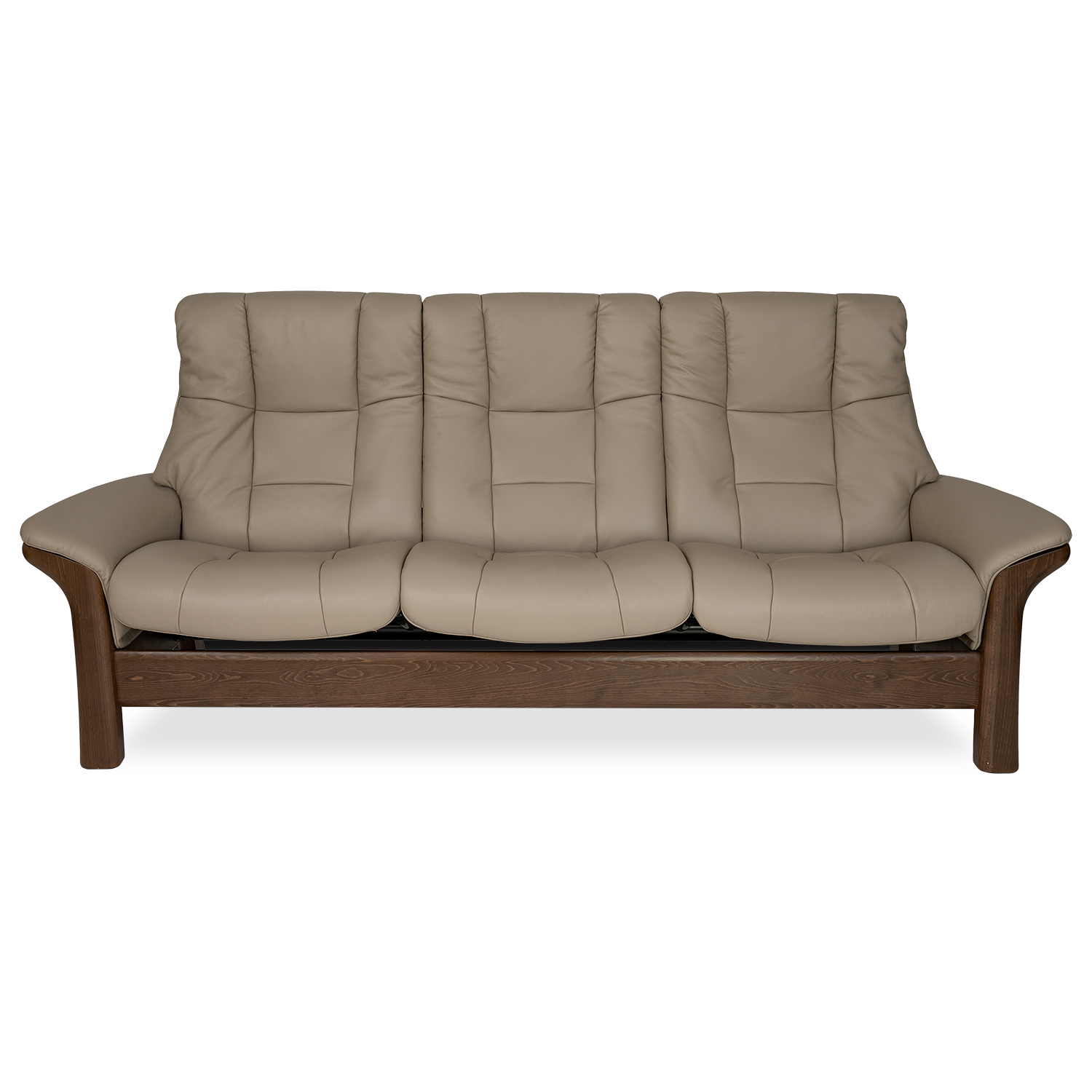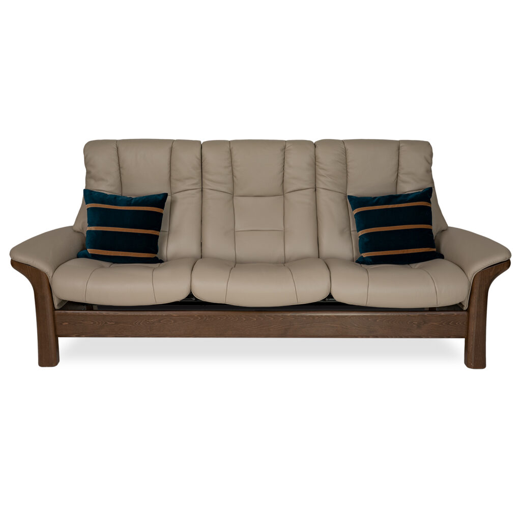 The Buckingham 3-Seat High Back Sofa, by Stressless® of Norway, features gentle curves and comfortably padded seats and armrests, with a walnut wood frame and Cori Special beige leather. Buckingham is equipped with Stressless® Plus™ and Glide Systems, which let the sofa provide continuous support for the head and lower back, while also adjusting the reclining angle of each individual seat based on shifts of the body. Sleek and comfortable, Buckingham invites you to sit back and relax in this classic design.