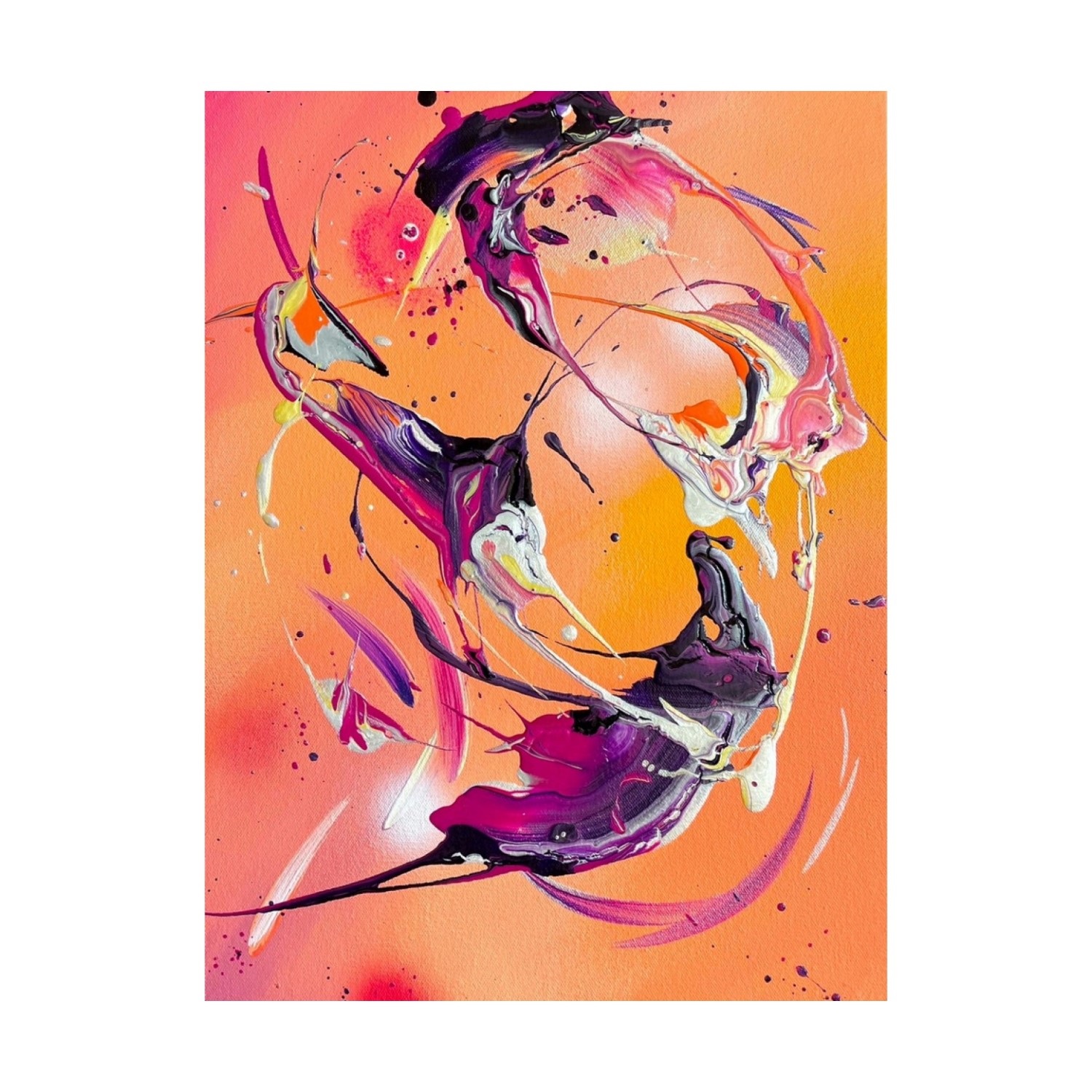 [0] => Burning Out is an abstract wall artwork painted by the artist Michael Carini. Spirited splashes of purple, pink, white, and yellow flow over a vibrant orange and pink background whose warm tones evoke the splendor of a sunset. Available with a glossy surface, this painting's saturated colors and dynamic brushwork will add a burst of energy to any space.