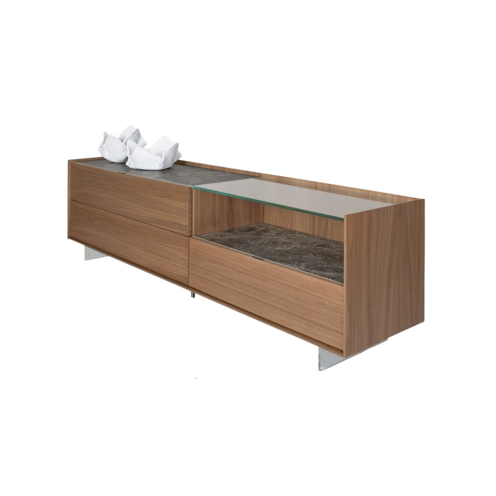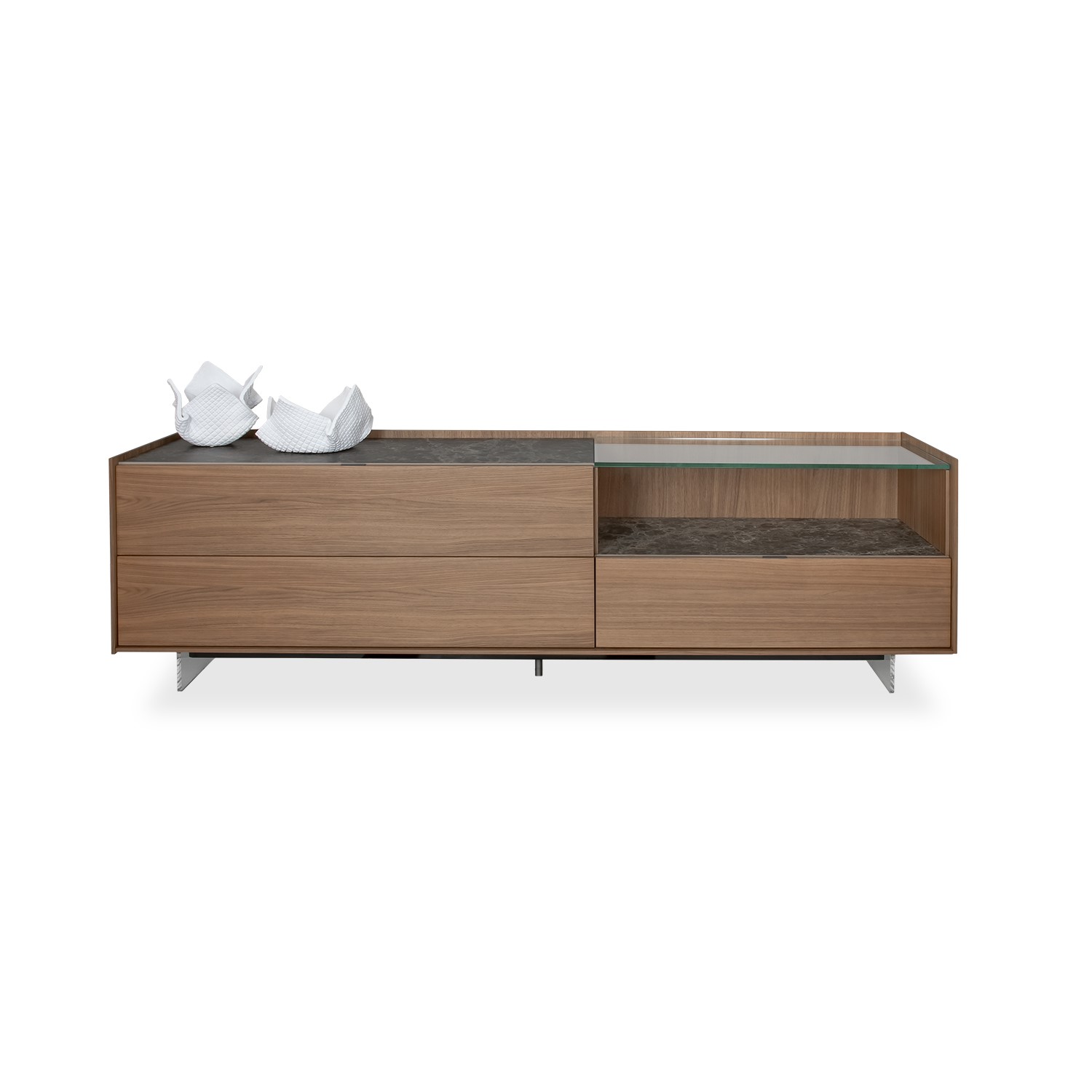 [0] => A contemporary Italian design with a mid-century modern touch, the Cabaret TV Cabinet features spacious storage and contrasting textures that lend it an edge. Cabaret includes two drawers and one cabinet in a Canaletto walnut veneer, two Emperador matte ceramic tops, and one right-facing clear glass top. Brown matte handles and flat rectangular legs complete the look.