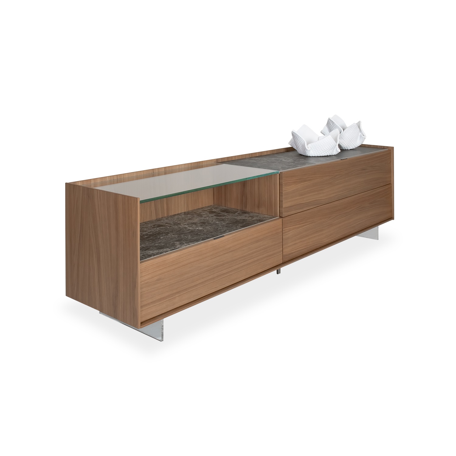 A contemporary Italian design with a mid-century modern touch, the Cabaret TV Cabinet features spacious storage and contrasting textures that lend it an edge. Cabaret includes two drawers and one cabinet in a Canaletto walnut veneer, two Emperador matte ceramic tops, and one left-facing clear glass top. Brown matte handles and flat rectangular legs complete the look.