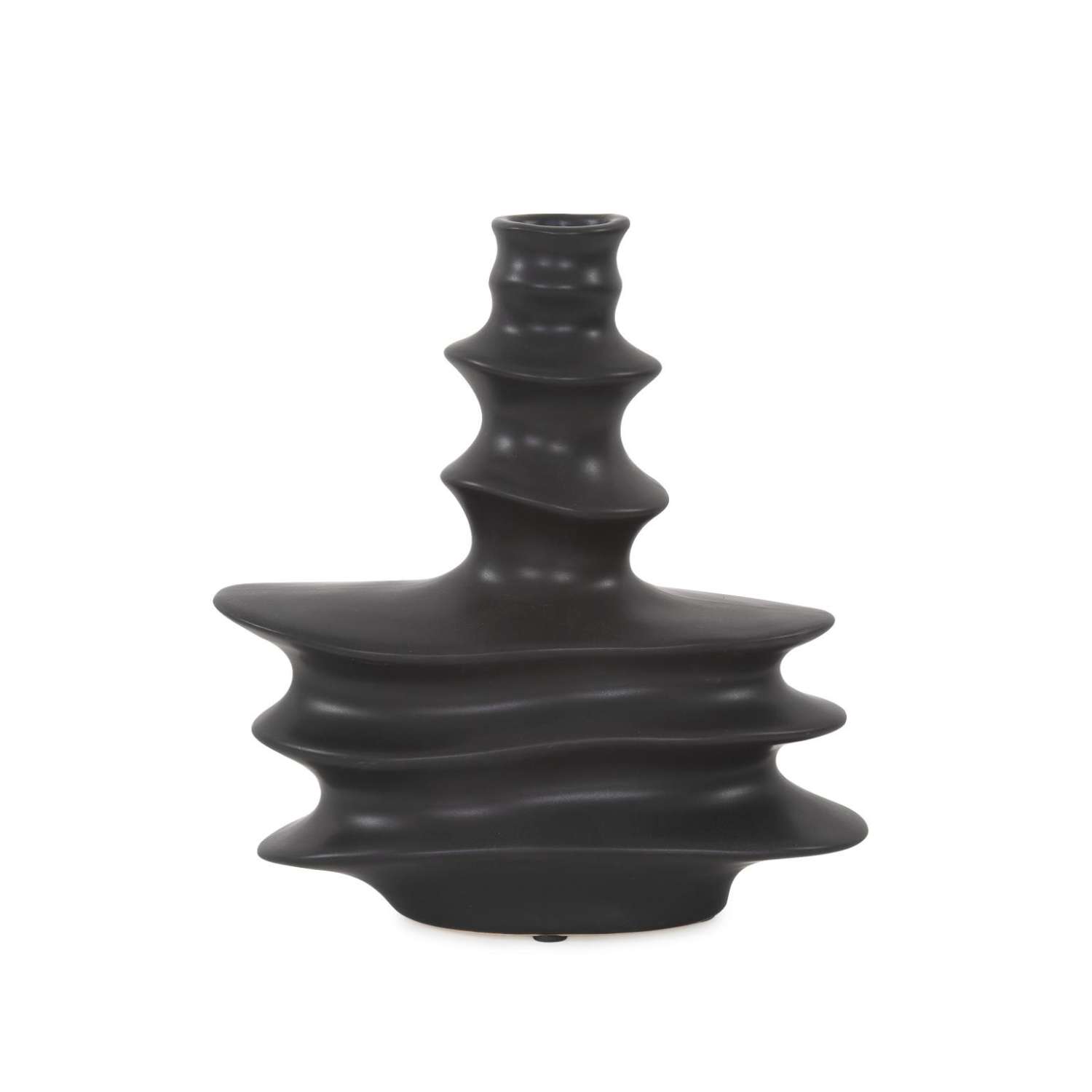 The Cairn Abstract Short Vase is made of ceramic with a hand-applied matte black finish, and has an organic shape with a wide body and narrow neck sculpted into flowing tiers and ridges. Inspired by the work of sculptor Robert Cairn, this vase's edgy form makes it a great conversation piece for modern and contemporary interiors.