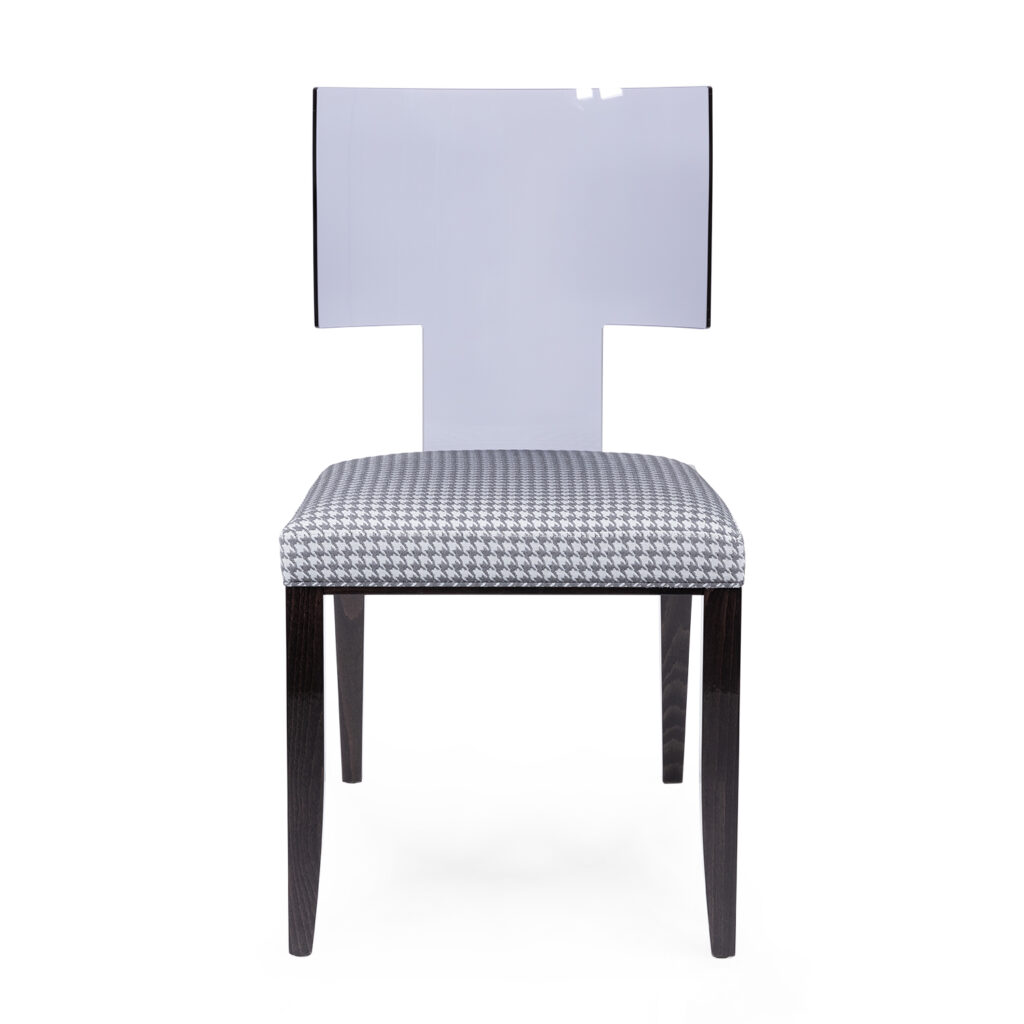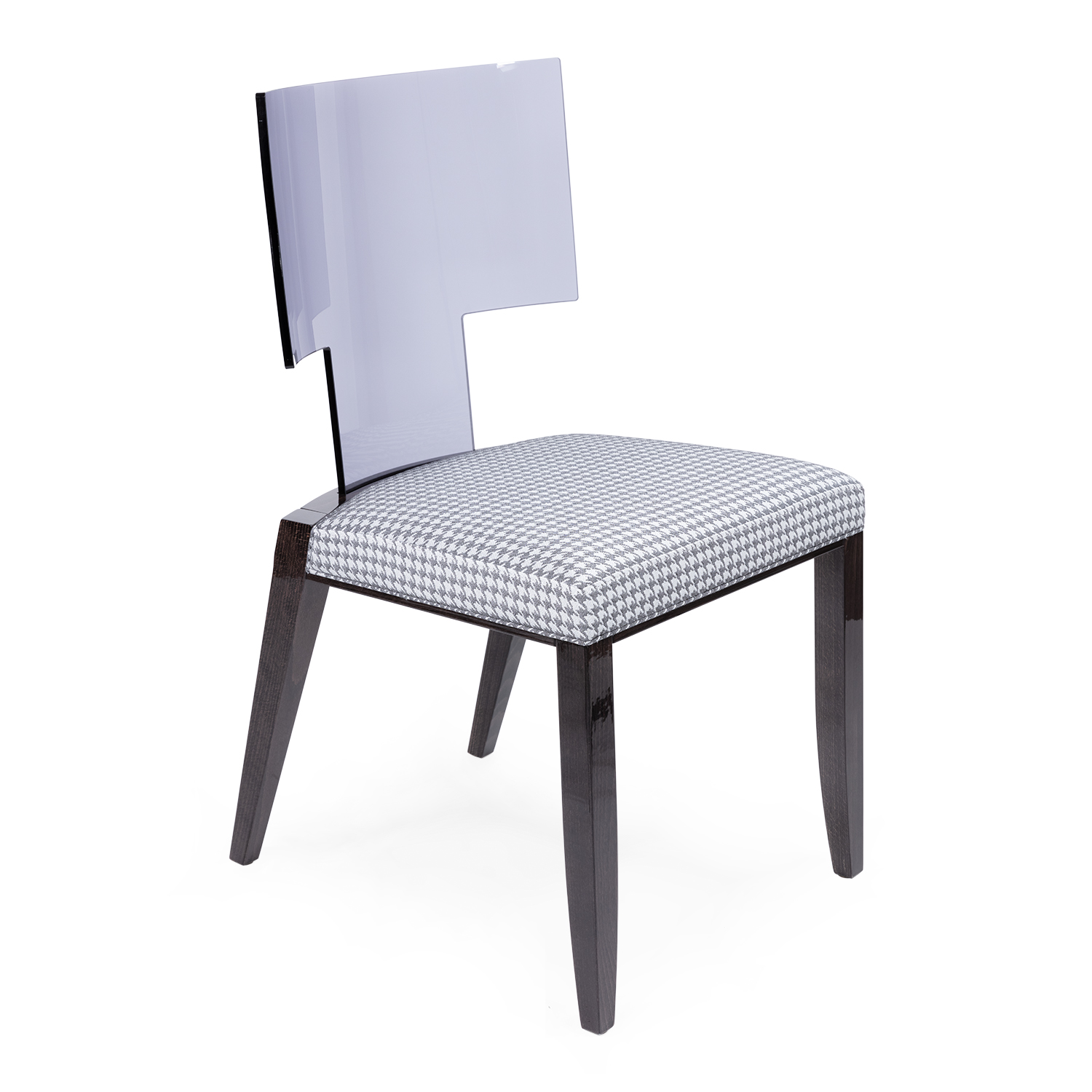 The Calipso Chair is chic and contemporary, with straight lines and mixed materials. The T-shaped seat back in smoke grey semi-transparent polycarbonate and the high-gloss, carbon black legs support a seat upholstered in a dark grey houndstooth fabric. Calipso's clean design and neutral colors help it integrate seamlessly into a variety of spaces.