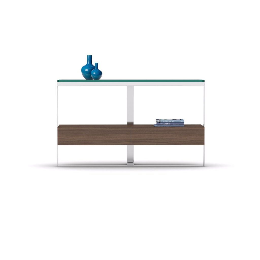The Calypso Console Table features a steel frame, clear glass top, and two walnut wood drawers. The drawer unit appears to float in the center of the frame, adding a futuristic look with intriguing angles, while the combination of textures creates a sense of balance. Perfect for both display and storage, Calypso will add clean, modern style to any room.