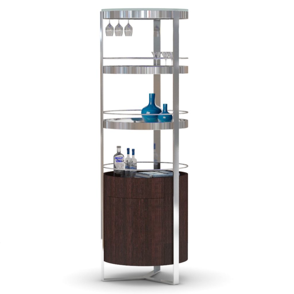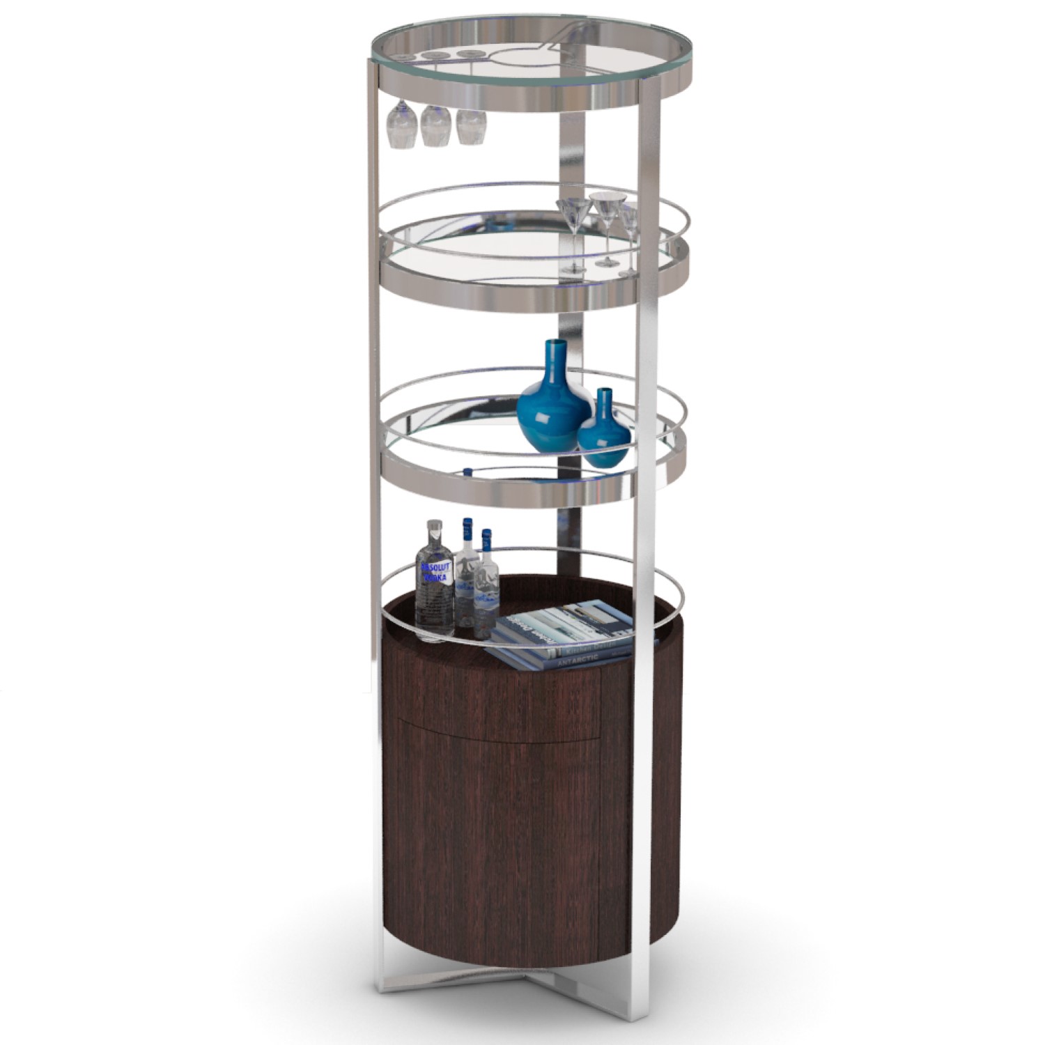 [0] => Entertain in style with the Calypso Bar Tower, available with a wenge wood finish and an open, three-tiered circular design. Featuring a stemware rack, two glass upper shelves, and a mirrored bottom shelf, Calypso is perfect for storing your bar essentials and displaying your favorite accessories and glasses. The round wood framed base, with one drawer and one cabinet, is supported by an angular steel structure, creating a suspended, floating effect that adds to the contemporary vibe of this bar tower.