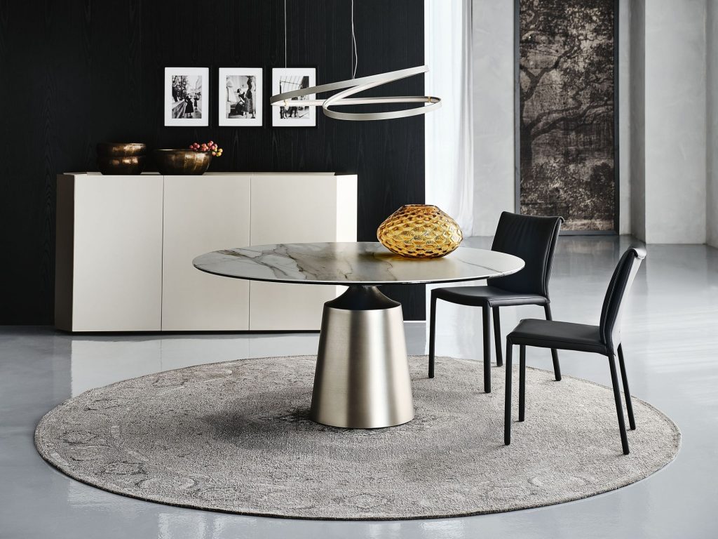 [description] => Clessidra Round Dining Table 59", Frame Flamed Walnut / Black Nickel Ring / Cryst