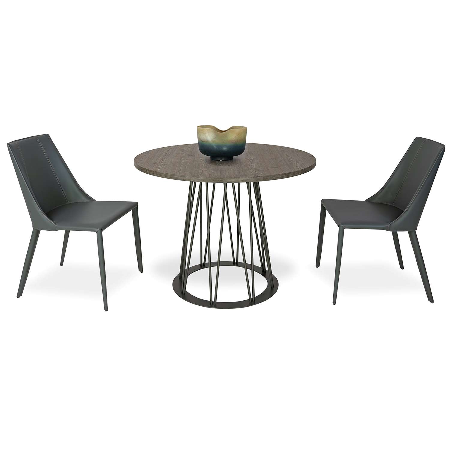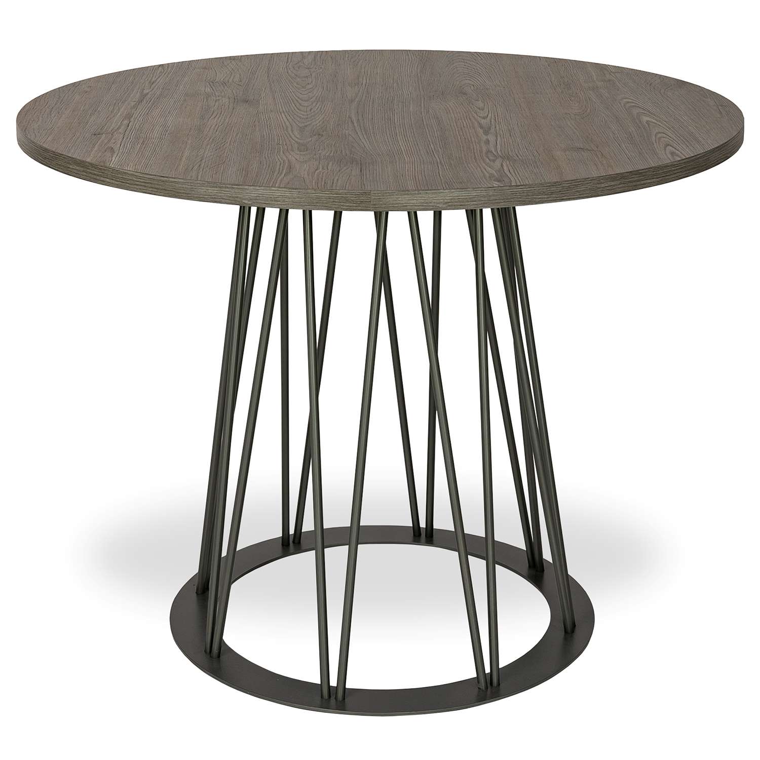 The Calypso Dining Table has a contemporary design featuring a sculptural geometric base in dark grey metal with a smooth satin finish. Calypso's round tabletop is made from thermo-fused laminate with a wood grain look, a material that is durable and easy to maintain, letting you enjoy this table's clean style for years to come. Calypso's compact size also makes it ideal for maximizing space in small dining rooms or dining nooks without sacrificing style.