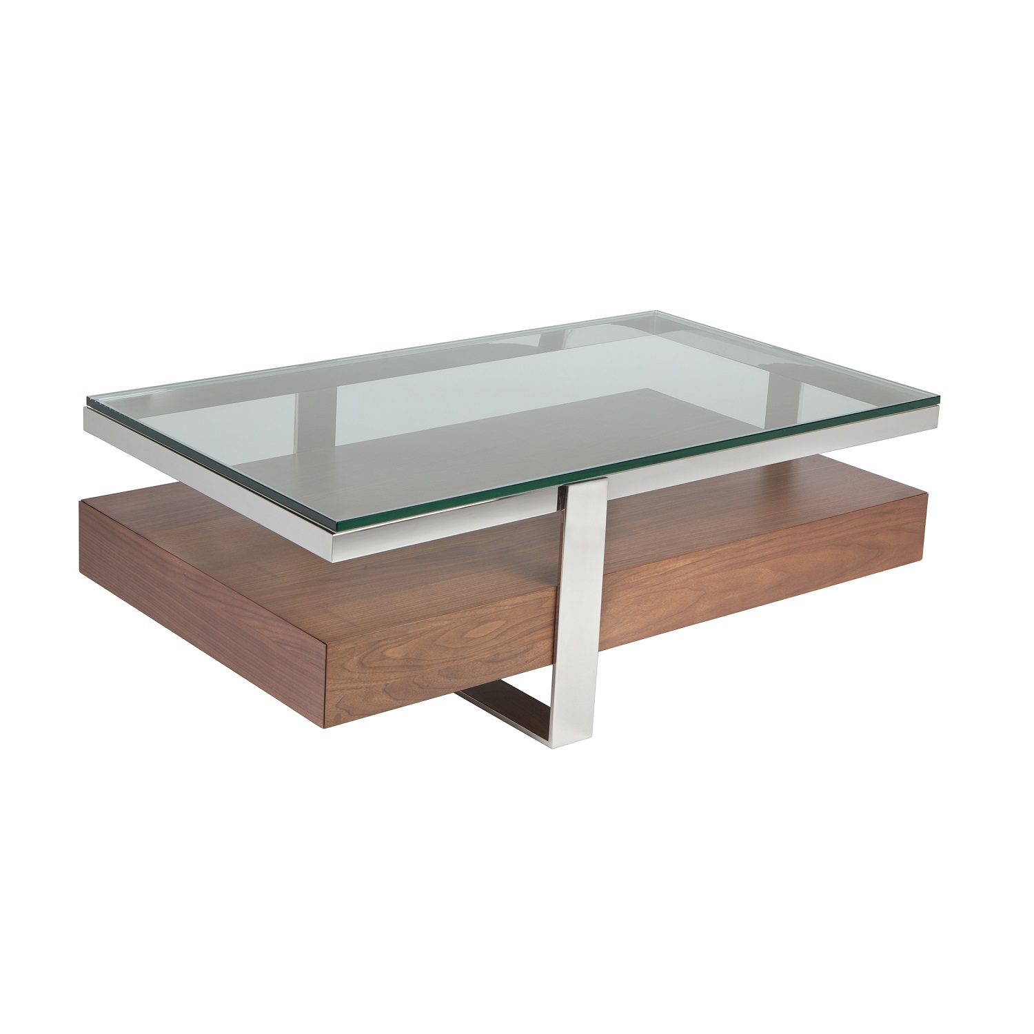 The Calypso Rectangular Coffee Table features a steel frame, clear glass tabletop, and walnut wood base with one storage drawer. The drawer unit appears to float in the center of the frame, creating a futuristic look with intriguing angles. Perfect for displaying figurines, vases, or reading material, Calypso will add clean, modern style to any living room.