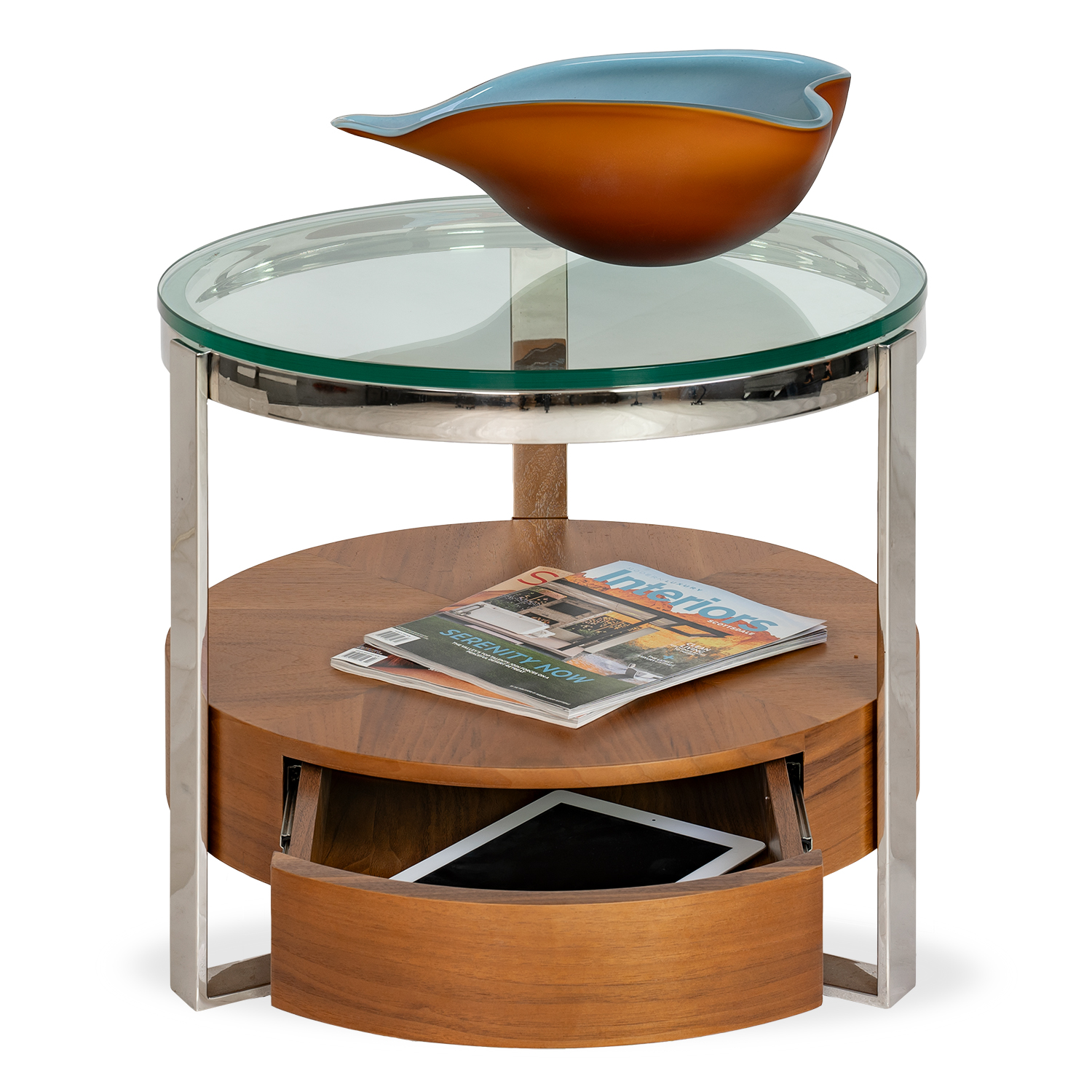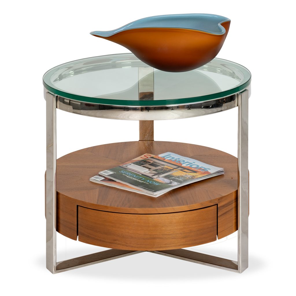 [0] => The Calypso Round End Table, available in walnut, features an open circular structure and a discreet drawer perfect for conveniently storing remotes or magazines. The clear glass tabletop elegantly complements the steel frame and allows you to view the drawer unit underneath. With its clean lines and minimalist aesthetic, Calypso will add a modern accent to any room.