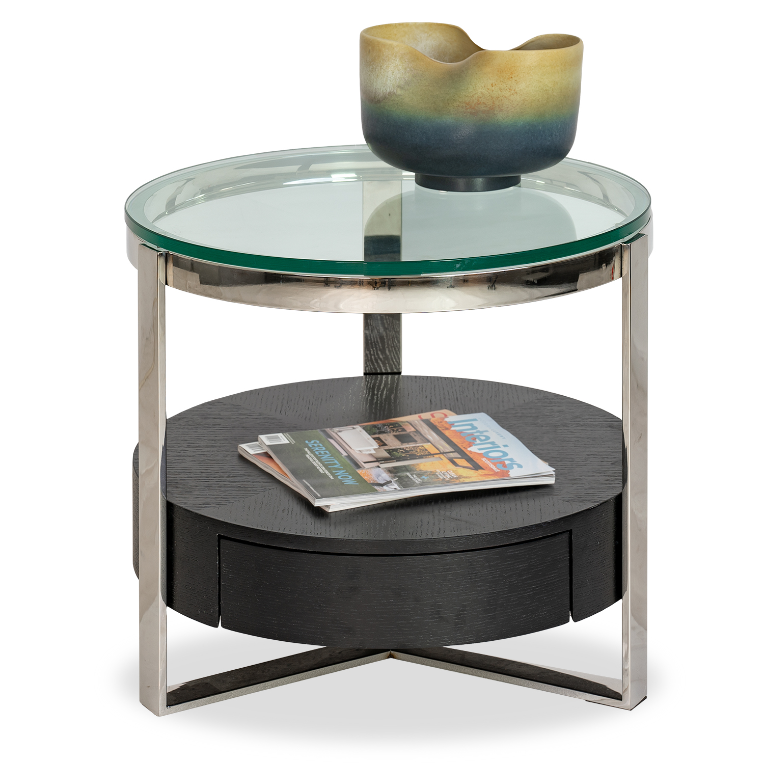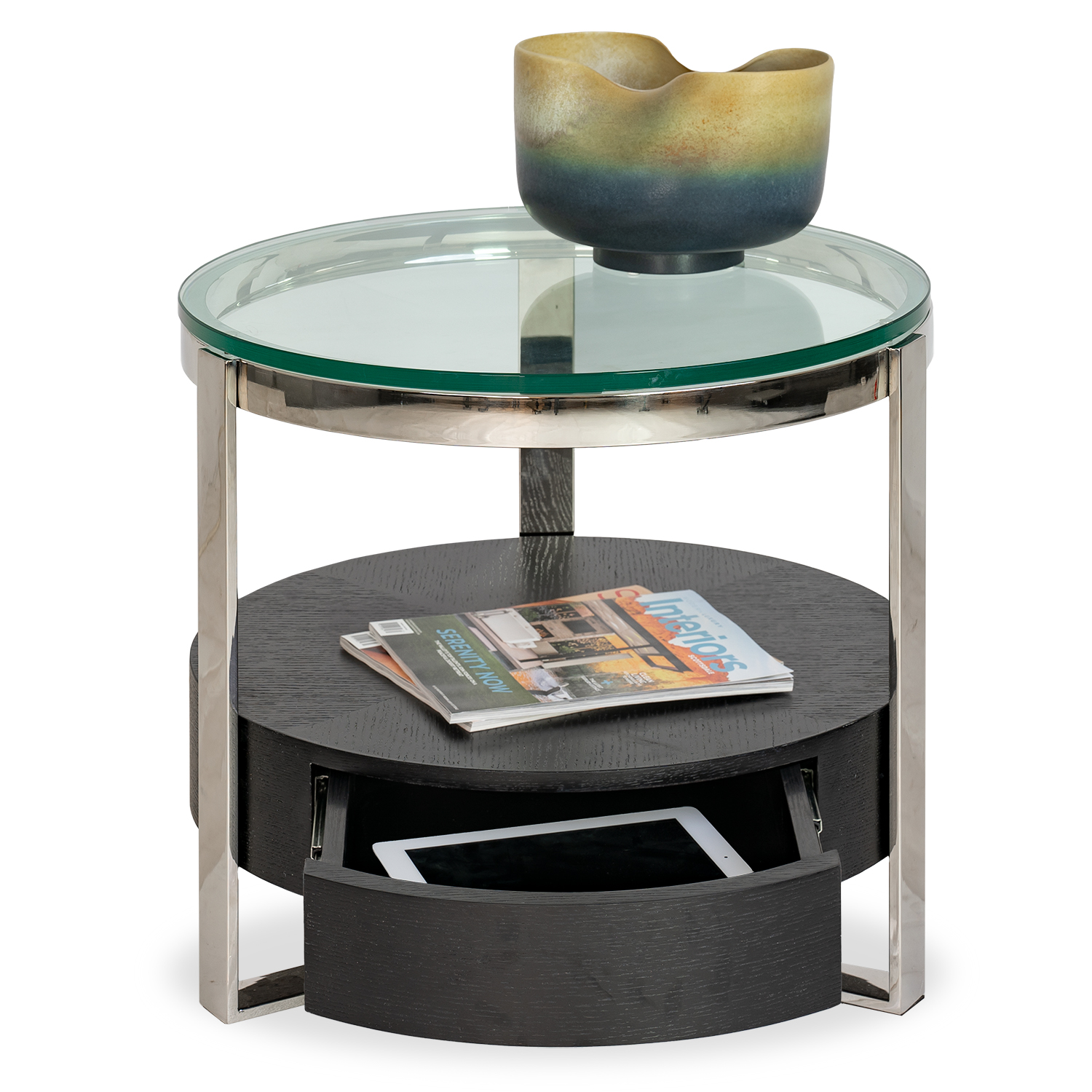 [0] => The Calypso Round End Table, available in a wenge finish, features an open circular structure and a discreet drawer perfect for conveniently storing remotes or magazines. The clear glass tabletop elegantly complements the steel frame and allows you to view the drawer unit underneath. With its clean lines and minimalist aesthetic, Calypso will add a modern accent to any room.
