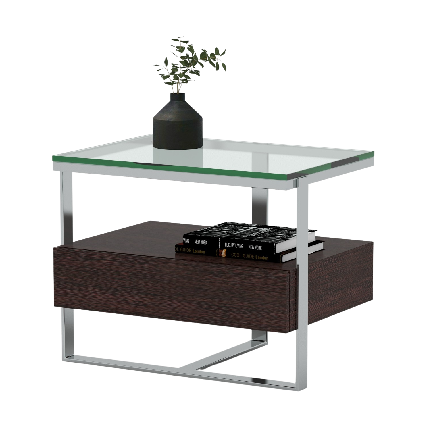The Calypso Side Table features a steel frame, clear glass tabletop, and wenge finished wood base with one storage drawer. The drawer unit appears to float in the center of the frame, creating a futuristic look with intriguing angles, while the combination of textures creates a sense of balance. Perfect for displaying a lamp, setting down a book, or storing living room odds and ends, Calypso will add clean, modern style to any home.