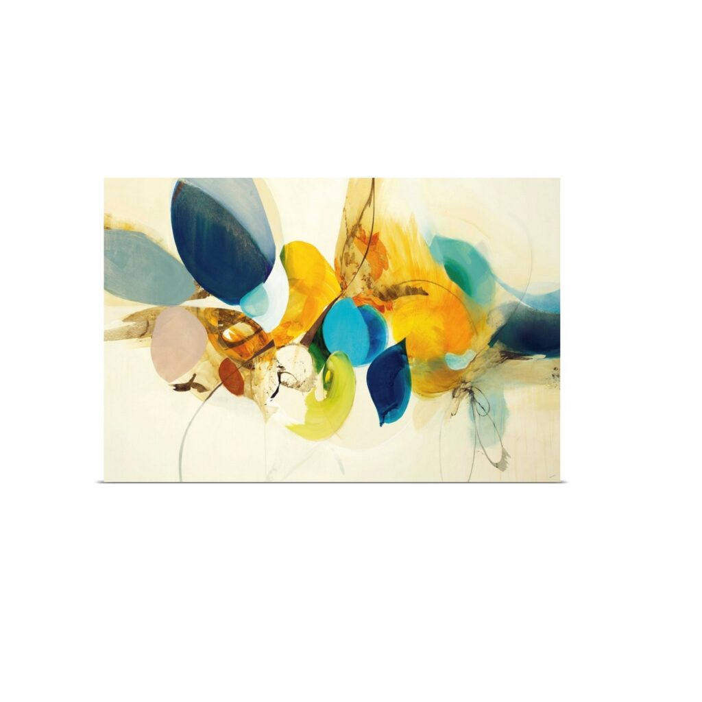 [0] => The Candid Color Wall Art features subtle rainbow colors, entwined to create dimension. Cool-toned blue and purple shapes form from the bright yellow center, possibly a bouquet of earthy flowers. The beige background pairs perfectly with this soft, colorful piece.