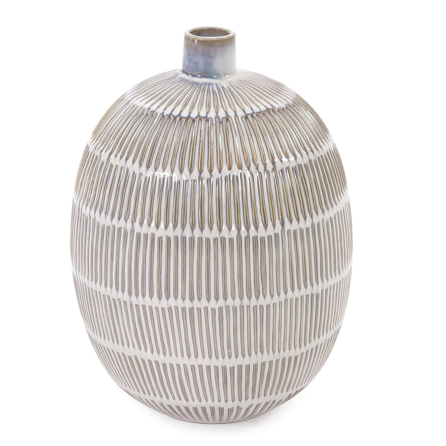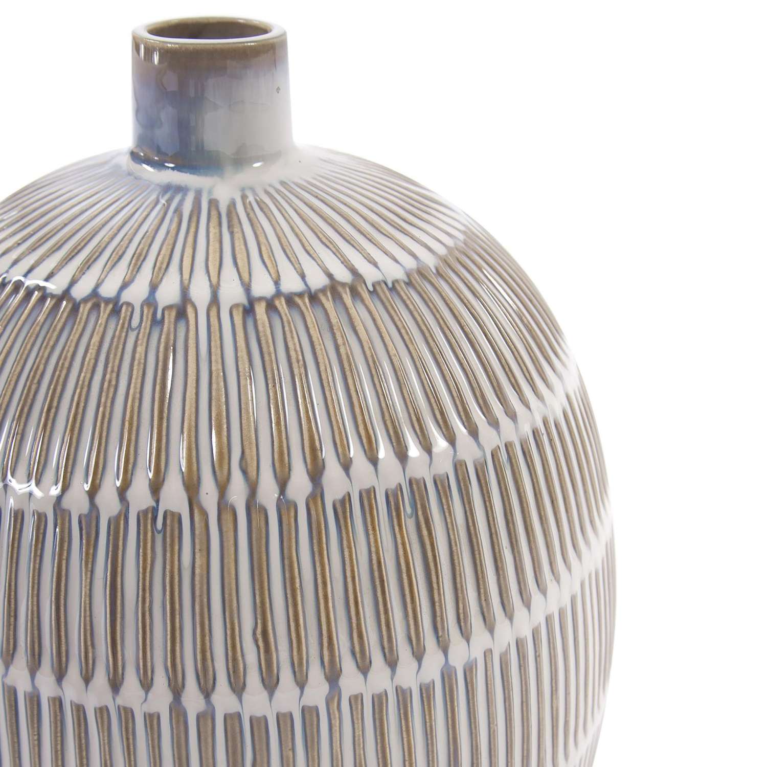Made from ceramic, the Caramel Cream Ridge Large Vase presents a blend of neutral tones and striking texture that will add an earthy touch to any interior. This cream-colored vase is adorned with lines of caramel brown ridged detailing and finished with a glossy glaze. The oval-shaped body is topped by a short, slender neck with a subtle color accent in dusty blue that further adds visual interest.
