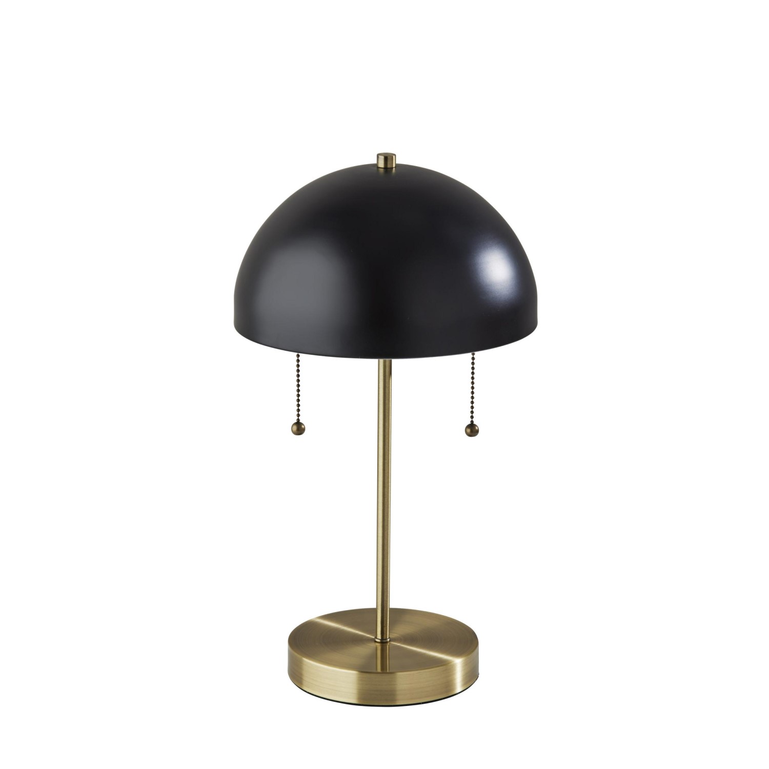 [0] => The Carissa Table Lamp has a vintage-inspired design, with a black dome shade and a base and pull chains in an antique brass finish. The base has an AC outlet for convenient access to power, whether the lamp is turned on or off. With its charming art deco style, the Carissa Table Lamp is the perfect accent for any home or office space.