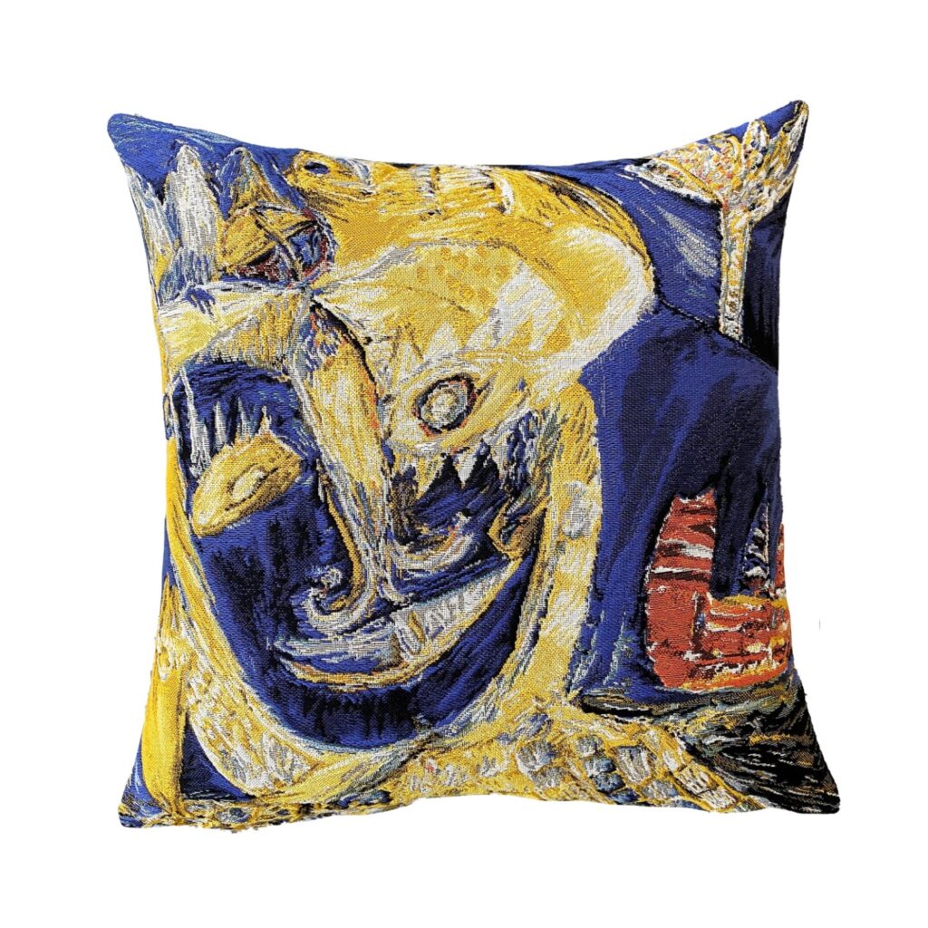 The Carl-Henning Pedersen - The Red Ship Pillow will add a creative touch to your living space. Bright primary colors form a smiling face and a small red ship, the abstract lines creating a sense of whimsy and fantasy. What makes the pillow truly "art" is its jacquard style woven design that brings Pedersen's work into your home, directly imported from France. The perfect gift or addition for an art enthusiast or anyone who loves a timeless masterpiece.