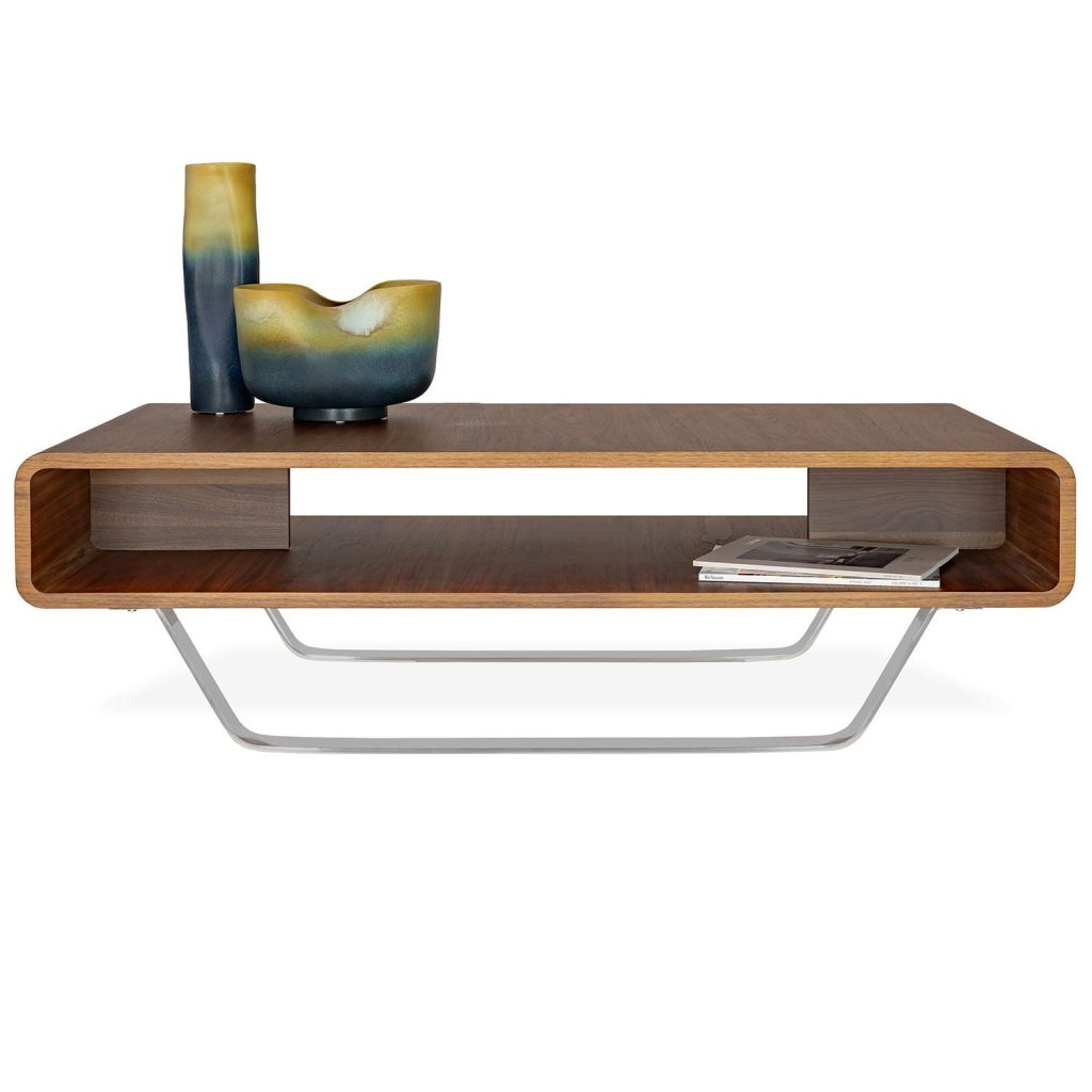 [0] => The Caro Coffee Table, available in natural walnut, features a beautifully curved tabletop and rounded sides. Angled chrome legs complement the open structure of the top, creating a balanced look, while the smooth wood encompasses a spacious storage shelf.