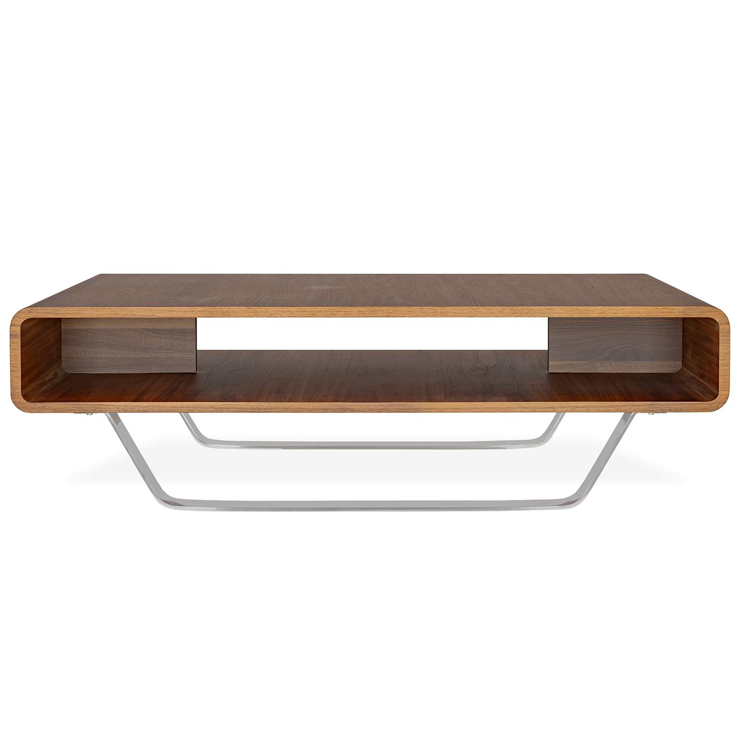 The Caro Coffee Table, available in natural walnut, features a beautifully curved tabletop and rounded sides. Angled chrome legs complement the open structure of the top, creating a balanced look, while the smooth wood encompasses a spacious storage shelf.