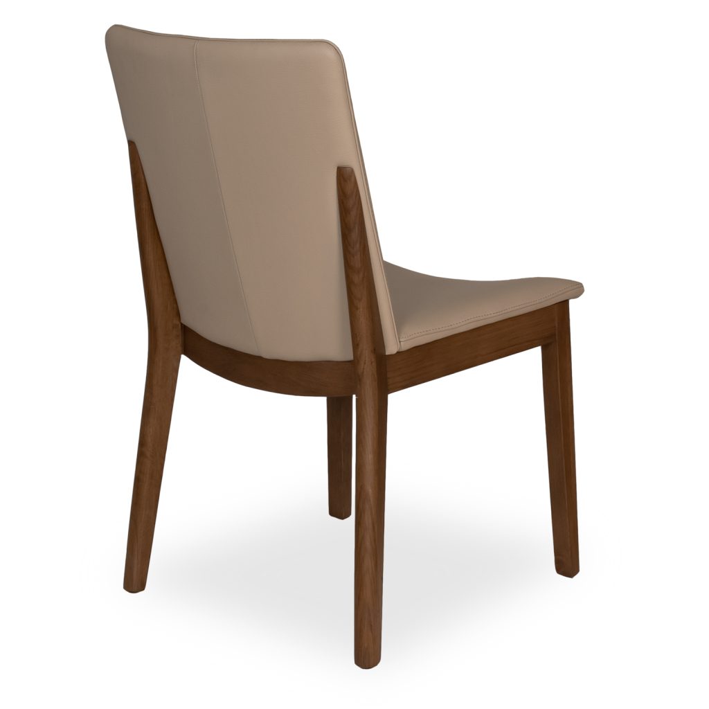 [0] => The Caroline Dining Chair features soft leather upholstery with a light mocha hue and walnut legs that extend partway up the backrest for a distinctive look. A curved and padded seat ensures your comfort, while the round legs, smooth corners, and tailored stitching create a pleasing and elegant impression. Caroline is a modern classic, perfect for a wide variety of design environments.
