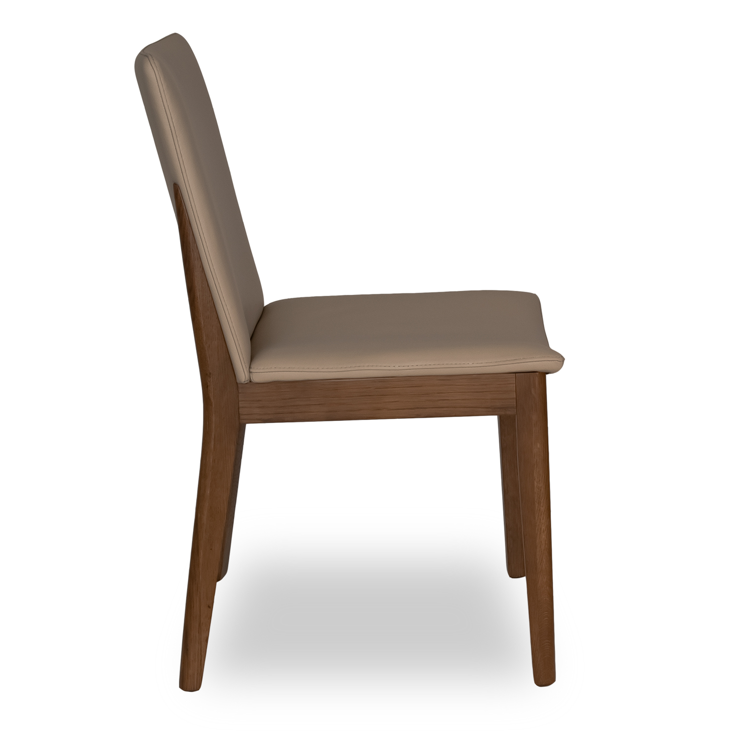 The Caroline Dining Chair features soft leather upholstery with a light mocha hue and walnut legs that extend partway up the backrest for a distinctive look. A curved and padded seat ensures your comfort, while the round legs, smooth corners, and tailored stitching create a pleasing and elegant impression. Caroline is a modern classic, perfect for a wide variety of design environments.
