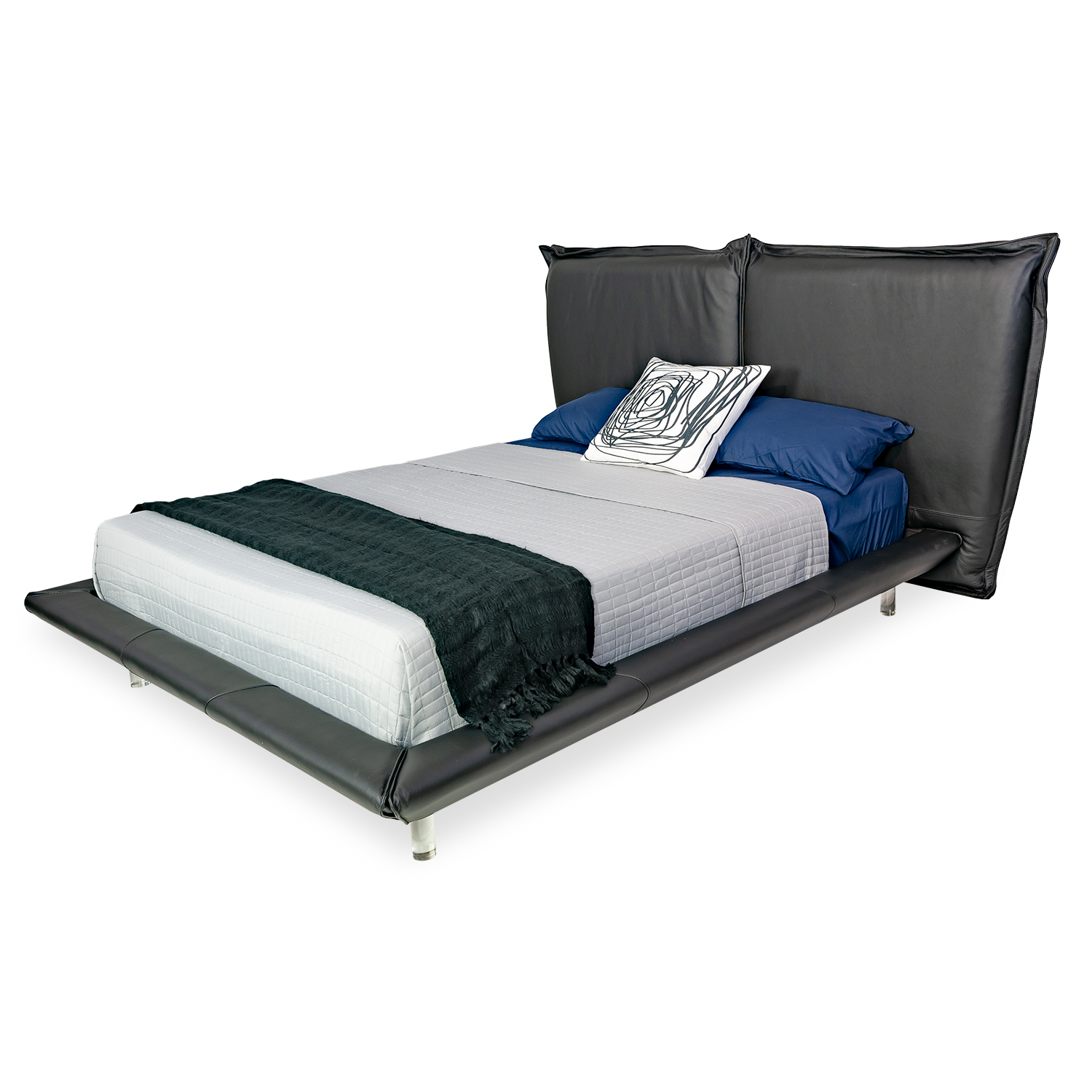 [0] => The Casablanca Queen Bed features a bold silhouette, black Brando leather upholstery, integrated LED lighting, and a slatted construction. Casablanca's dramatic headboard is composed of two large, cushioned sections with tailored edges that evoke the look of pillow shams. Embellished with accent stitching, the lower frame is inset with remote-controlled LEDs that offer mood lighting or a helpful nightlight. This Italian-made bed has everything you need to bring your bedroom ambiance to the next level.