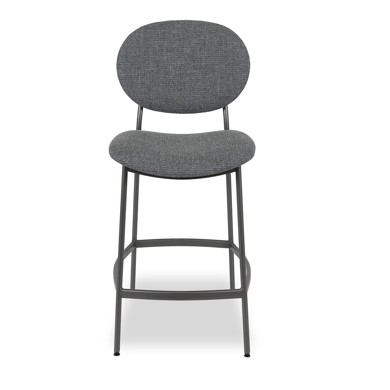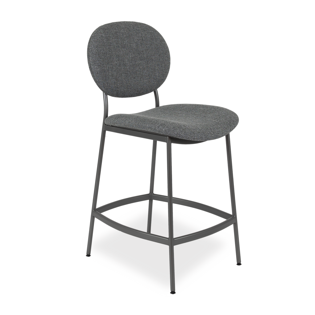 [0] => The Cassandra Counter Stool is both cozy and chic, with a curved backrest and seat that hug and comfort your body as you sit. Cassandra's minimalist form allows it to fit well with any contemporary dcor, while making a clean, subtle design statement. Available with an opaque, metallo metal frame, and tuxedo fabric upholstery that features variegated tones of grey.