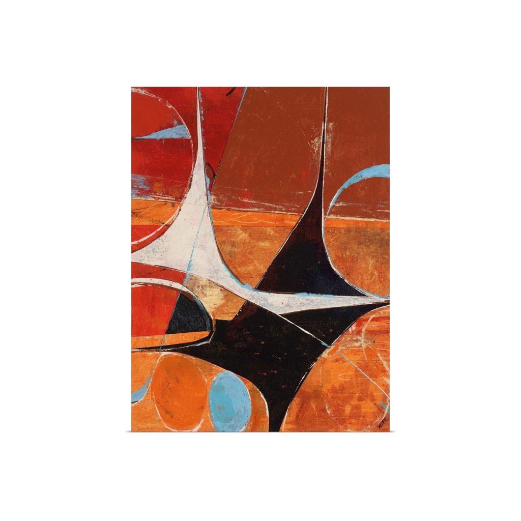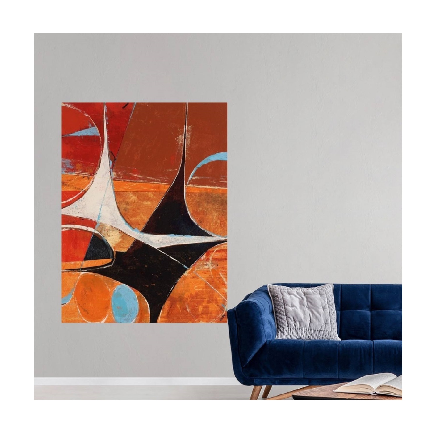 [0] => The Catch Up Wall Art, by Tony Wire, is an abstract piece mixing bold color with a contemporary vibe. Warm, earthy reds and oranges contrast with cooler tones of black, white, and blue. Intersecting lines and shapes add a sense of energy and dynamism, while a glossy surface adds extra shine.