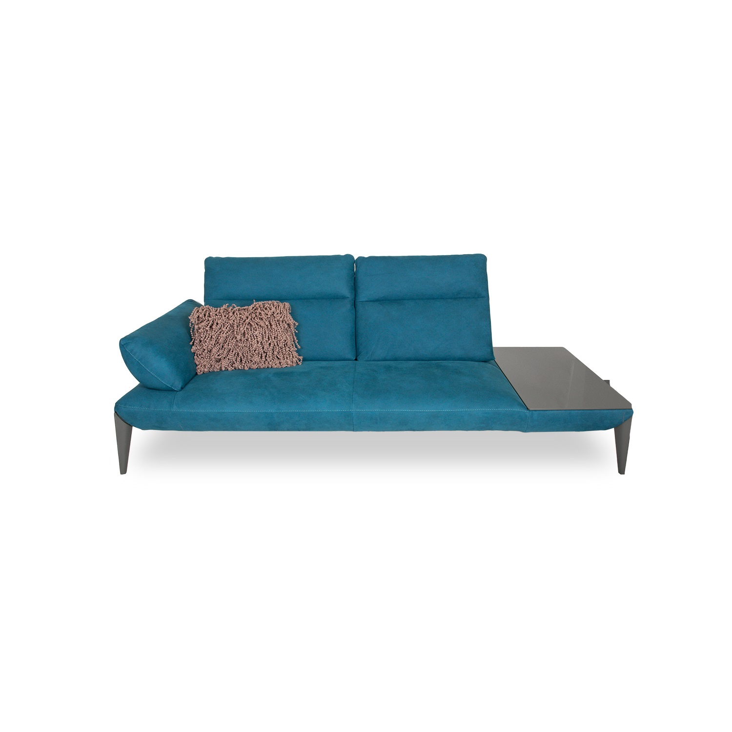 The Caveoso Sofa features sleek, modern design, with microfiber cashmere upholstery in bright peacock blue, a single arm, and adjustable backrests. The integrated table in grey glass adds a convenient spot to store remotes or place your drink. Linear stitching gives the sofa a tailored look, and the tapered grey metal legs complement the grey of the table. Caveoso's contemporary look and bright color make it easy to make a comfortable statement in any living space.