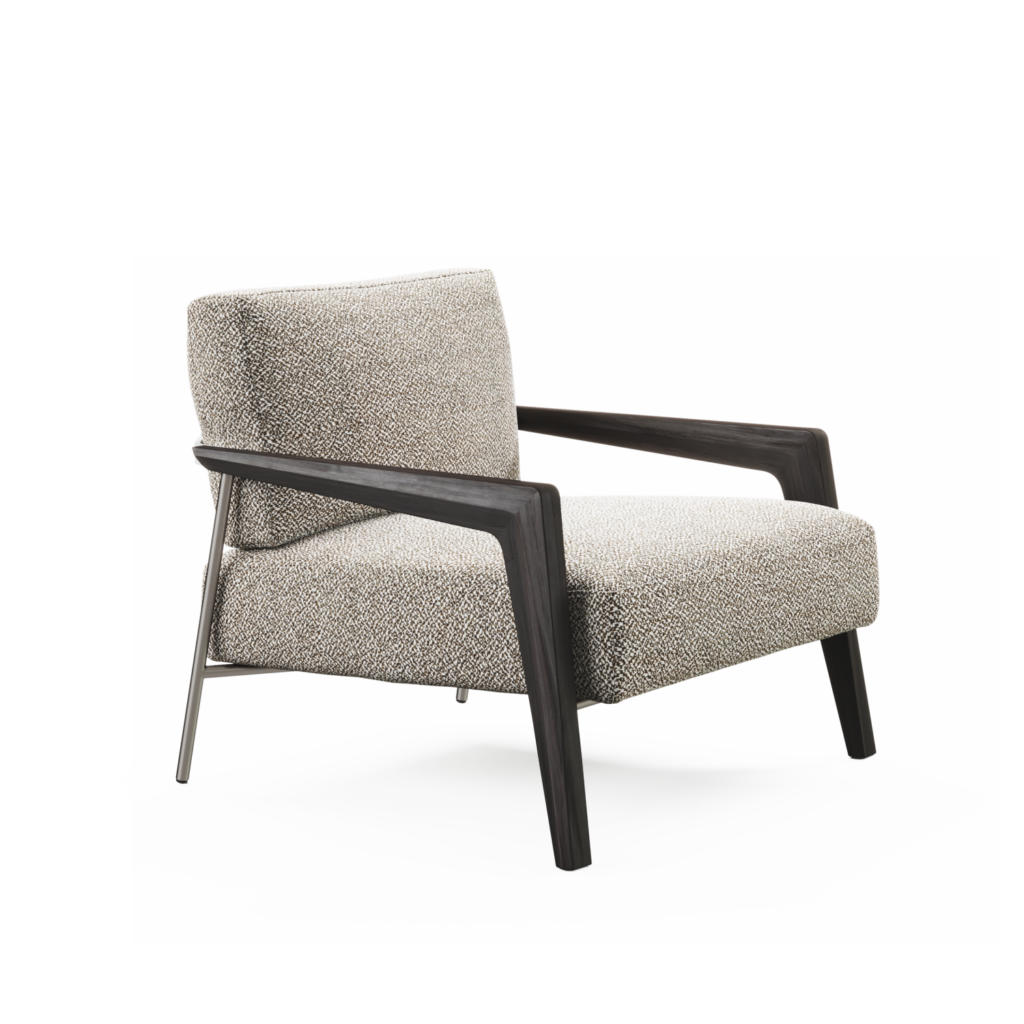 [0] => Made in Italy and designed by architects Roberto Tapinassi and Maurizio Manzoni of Studio Memo, the Cecile Armchair has a classic, streamlined look that radiates Italian elegance. The wide, deep seat and seat back are upholstered in Calafee sabbia fabric with a subtle pattern, and the arms are in dark oak wood. The frame in French bronze metal complements both the black and brown tones of the chair. A combination of foam and goose feather padding in the seat and back gives Cecile an ultra-comfortable feel.