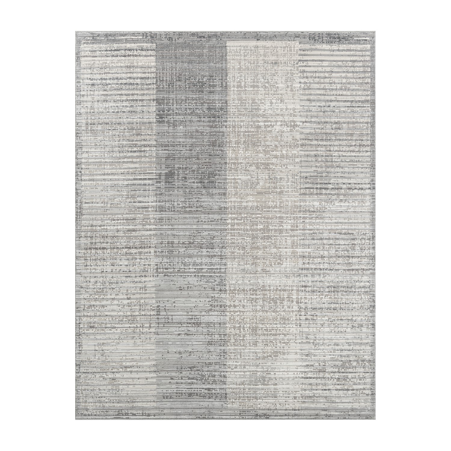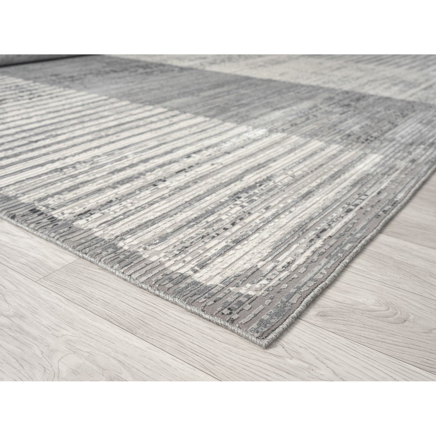 The Celeste Rug features a striped pattern in soft grey and white and a slightly textured power loom weave for a minimalist look with subtle dimension. Made from a combination of acrylic and Silkette, silk-like viscose yarns, Celeste is soft and luxurious and can integrate into a wide variety of design environments.