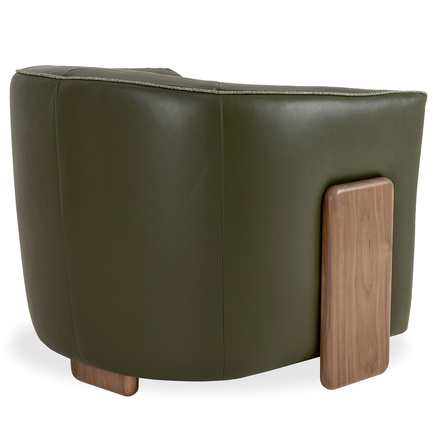 Bring Italian style to your living space with Incanto's Celestia Chair, featuring a sophisticated blend of materials and textures. Celestia is upholstered in dark olive green Giotto leather with a contrast welt in variegated green fabric. Two wooden accent legs in Canaletto walnut extend up the sides of the chair for a stylish look. The curved backrest and armrests create a cozy, enveloping feel, enhanced by a soft and buoyant seat cushion that offers premium comfort.