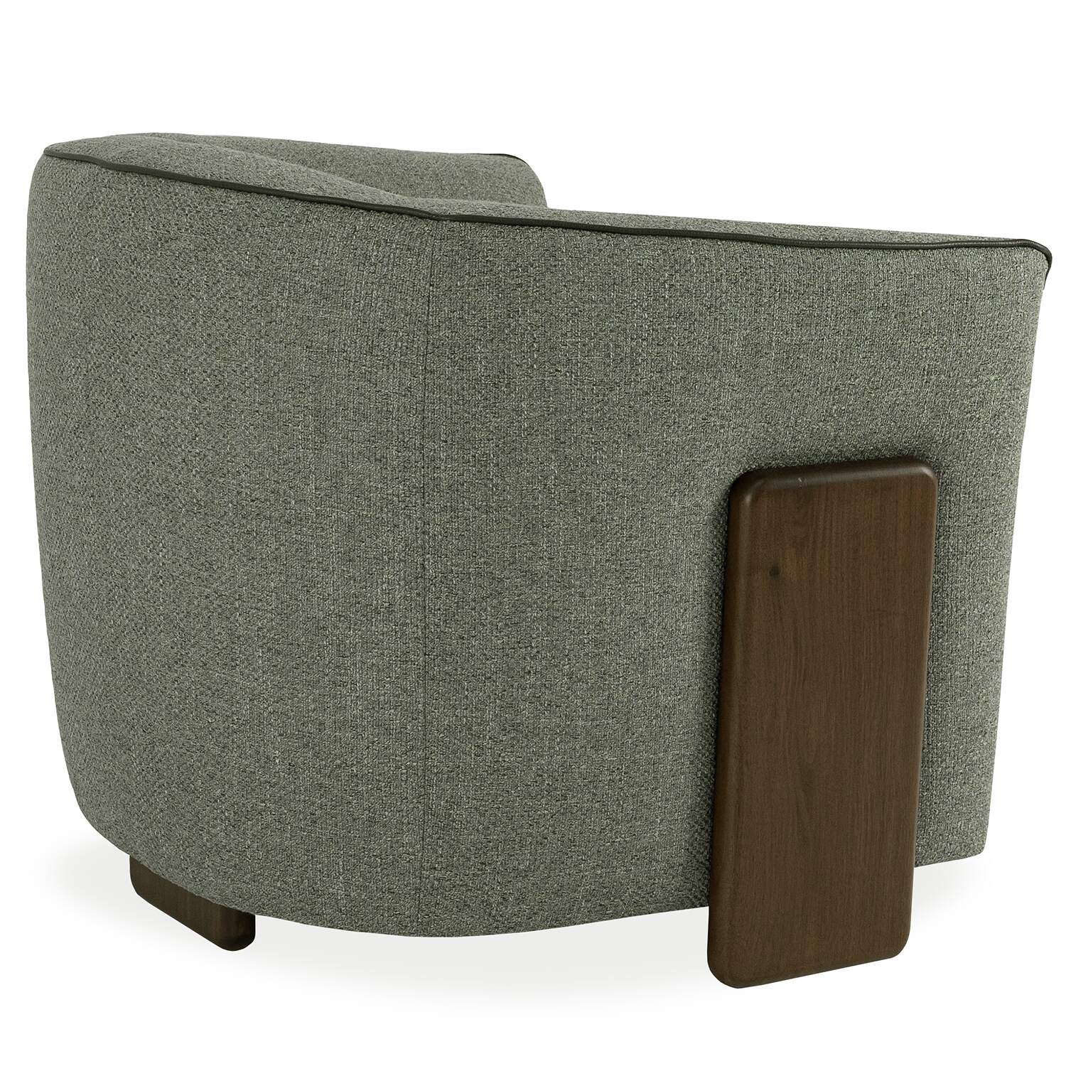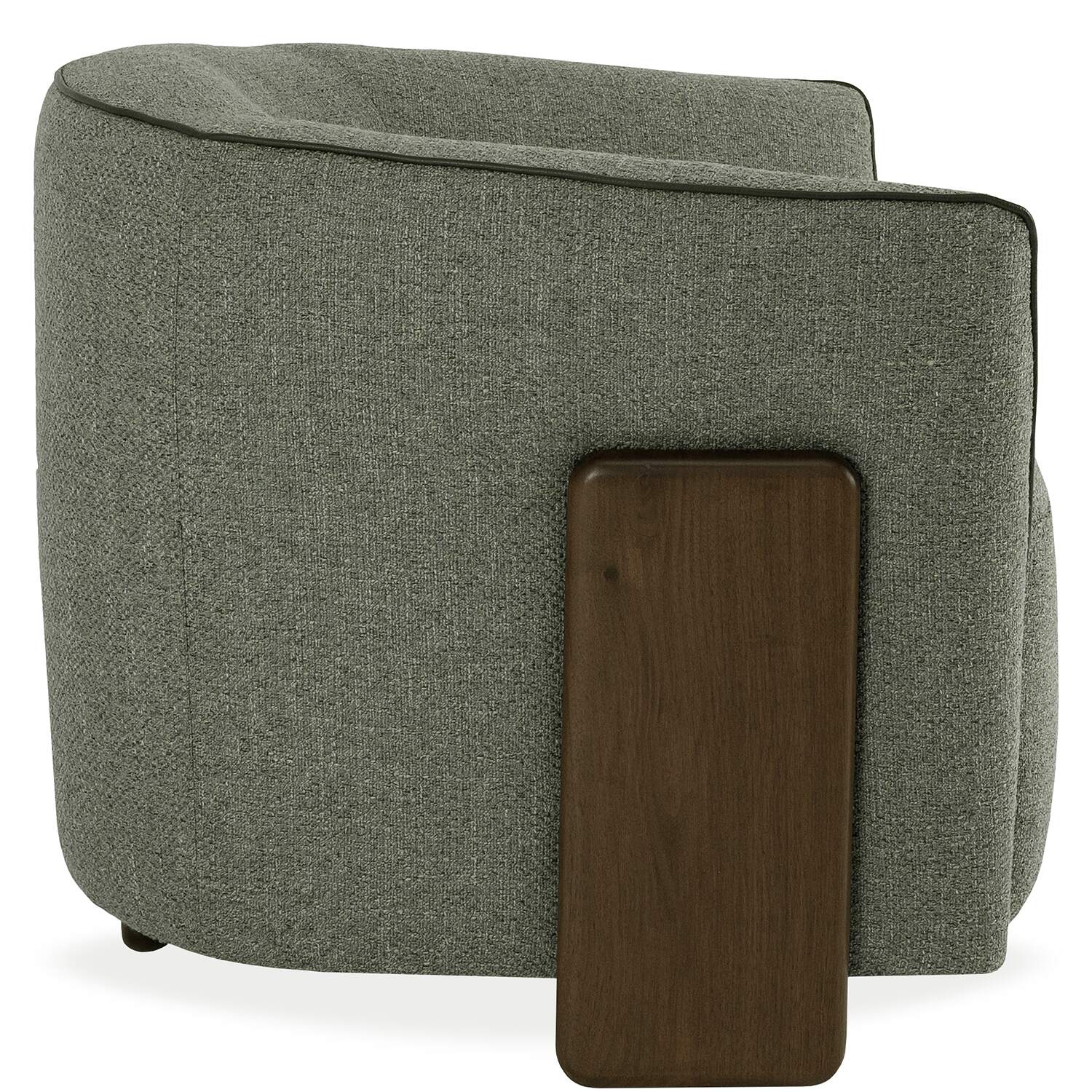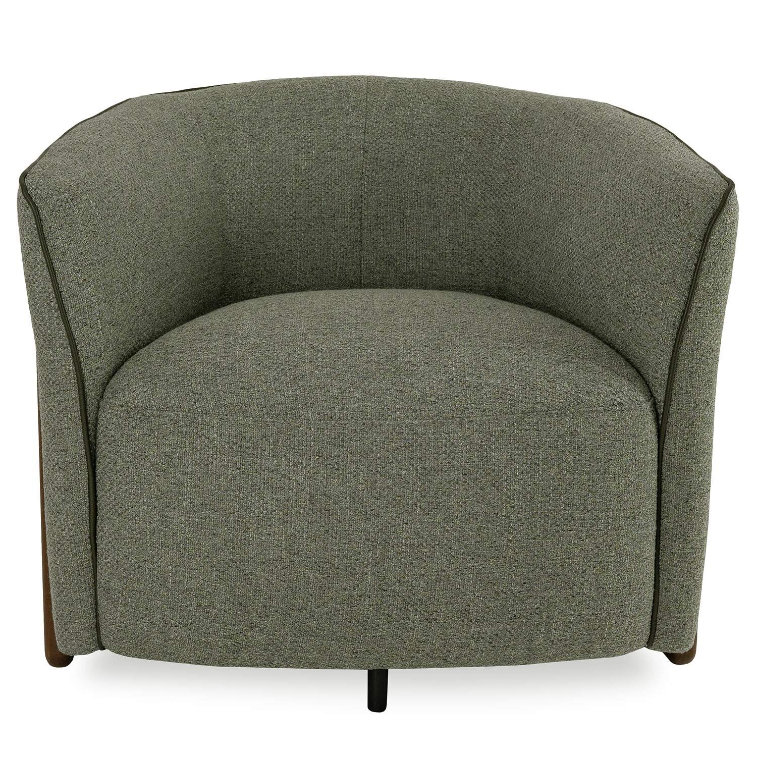 Bring Italian style to your living space with Incanto's Celestia Chair, featuring a sophisticated blend of materials and textures. Celestia is upholstered in variegated fabric with shades of olive green, sage green, lime green, and grey, complemented by a contrast welt in olive green leather. Two wooden accent legs in dark Canaletto walnut extend up the sides of the chair for a stylish look. The curved backrest and armrests create a cozy, enveloping feel, enhanced by a soft and buoyant seat cushion that offers premium comfort.