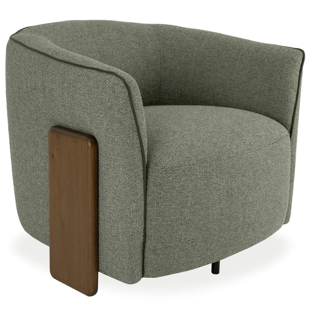 [0] => Bring Italian style to your living space with Incanto's Celestia Chair, featuring a sophisticated blend of materials and textures. Celestia is upholstered in variegated fabric with shades of olive green, sage green, lime green, and grey, complemented by a contrast welt in olive green leather. Two wooden accent legs in dark Canaletto walnut extend up the sides of the chair for a stylish look. The curved backrest and armrests create a cozy, enveloping feel, enhanced by a soft and buoyant seat cushion that offers premium comfort.