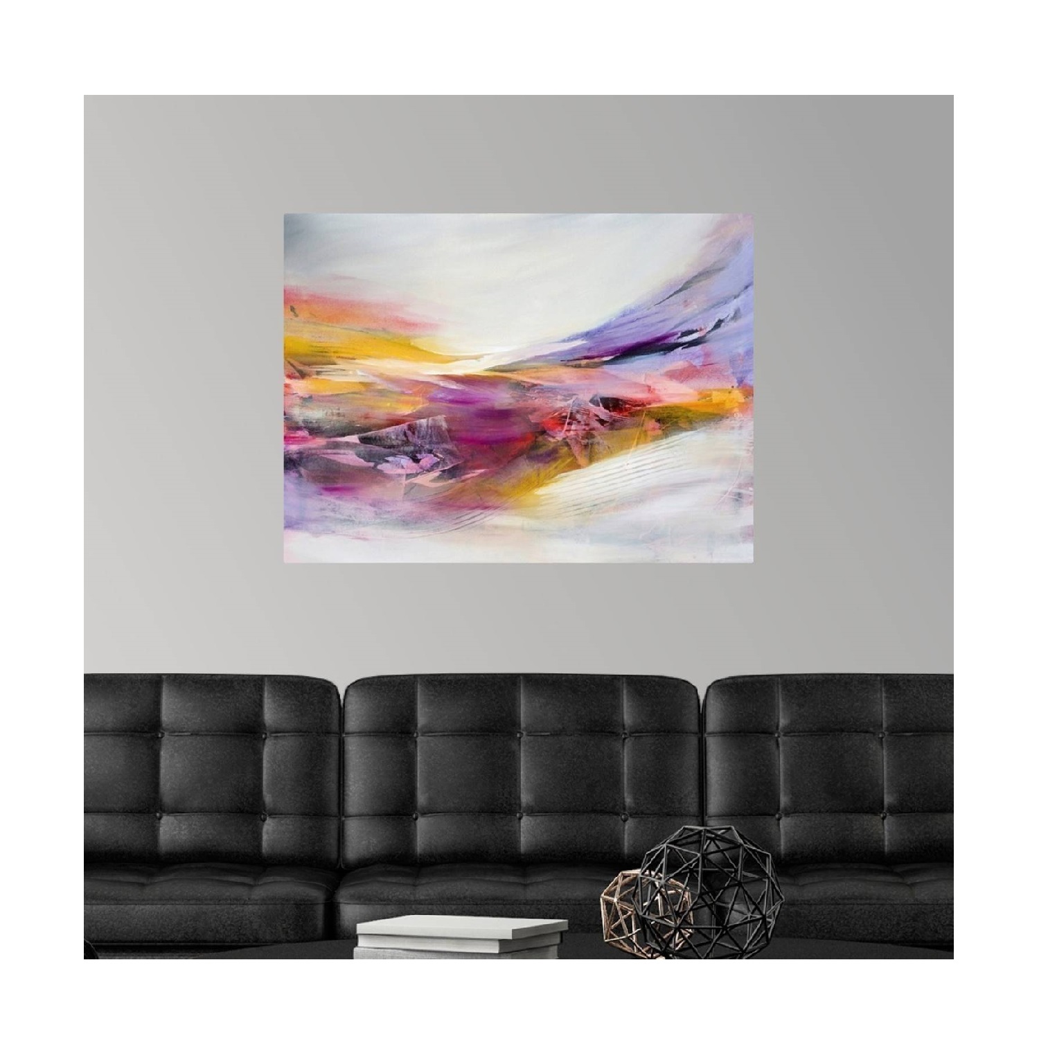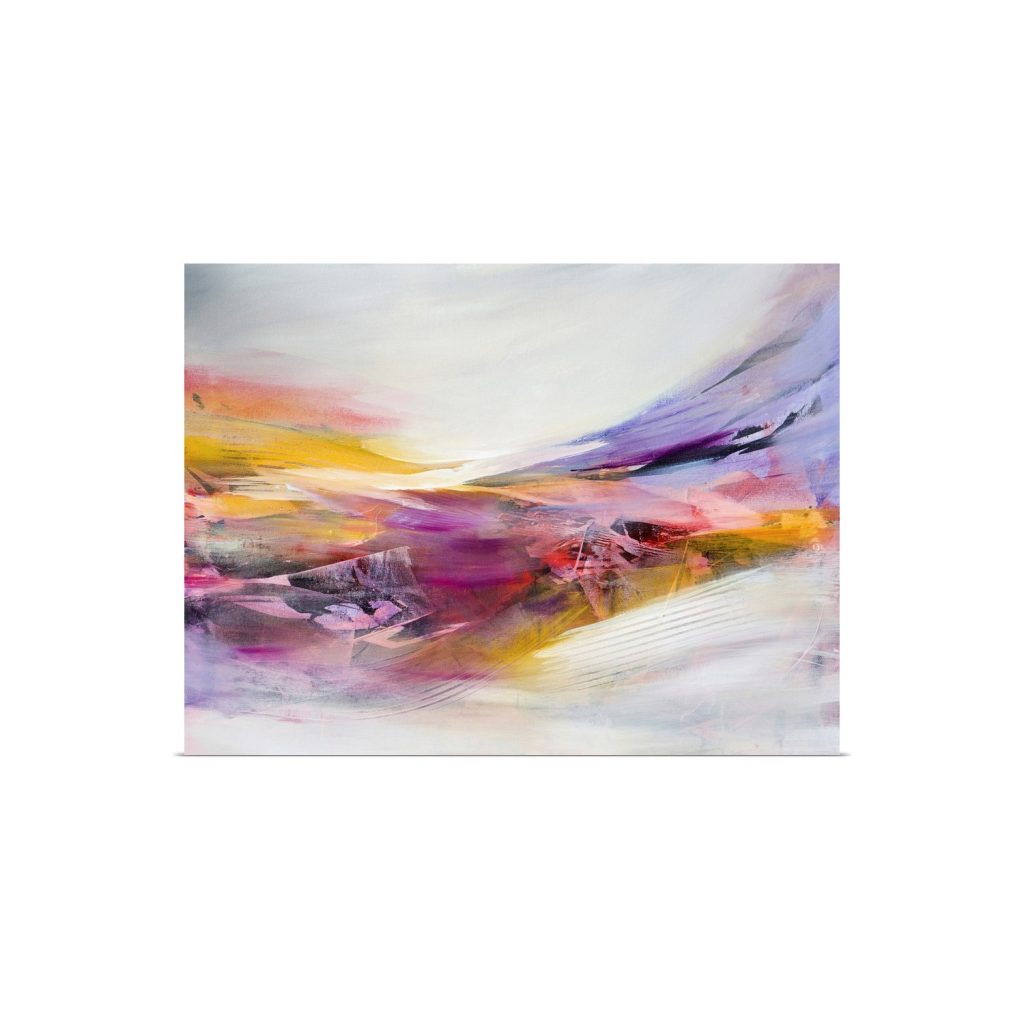 The Chasing Time Wall Art, by Karen Hale, is an abstract piece full of color and motion. Purples, yellows, and reds meet over a light grey background, finished off by a matte surface. Sweeping lines and sharp edges make the colors feel like they are clashing, yet harmonizing. This artwork will add a tranquil yet dynamic touch to a home or office.