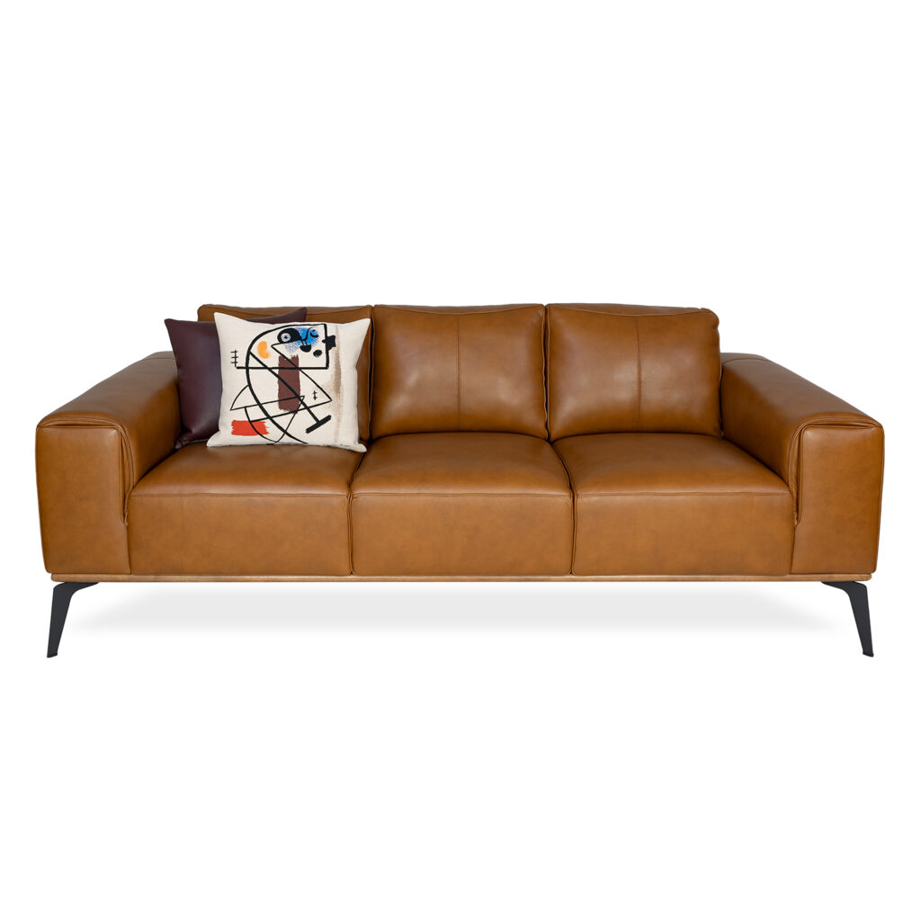 [0] => chelsea 3 seat sofa in missouri top-grain leather 681 brown with black powder coat legs. 86" long.