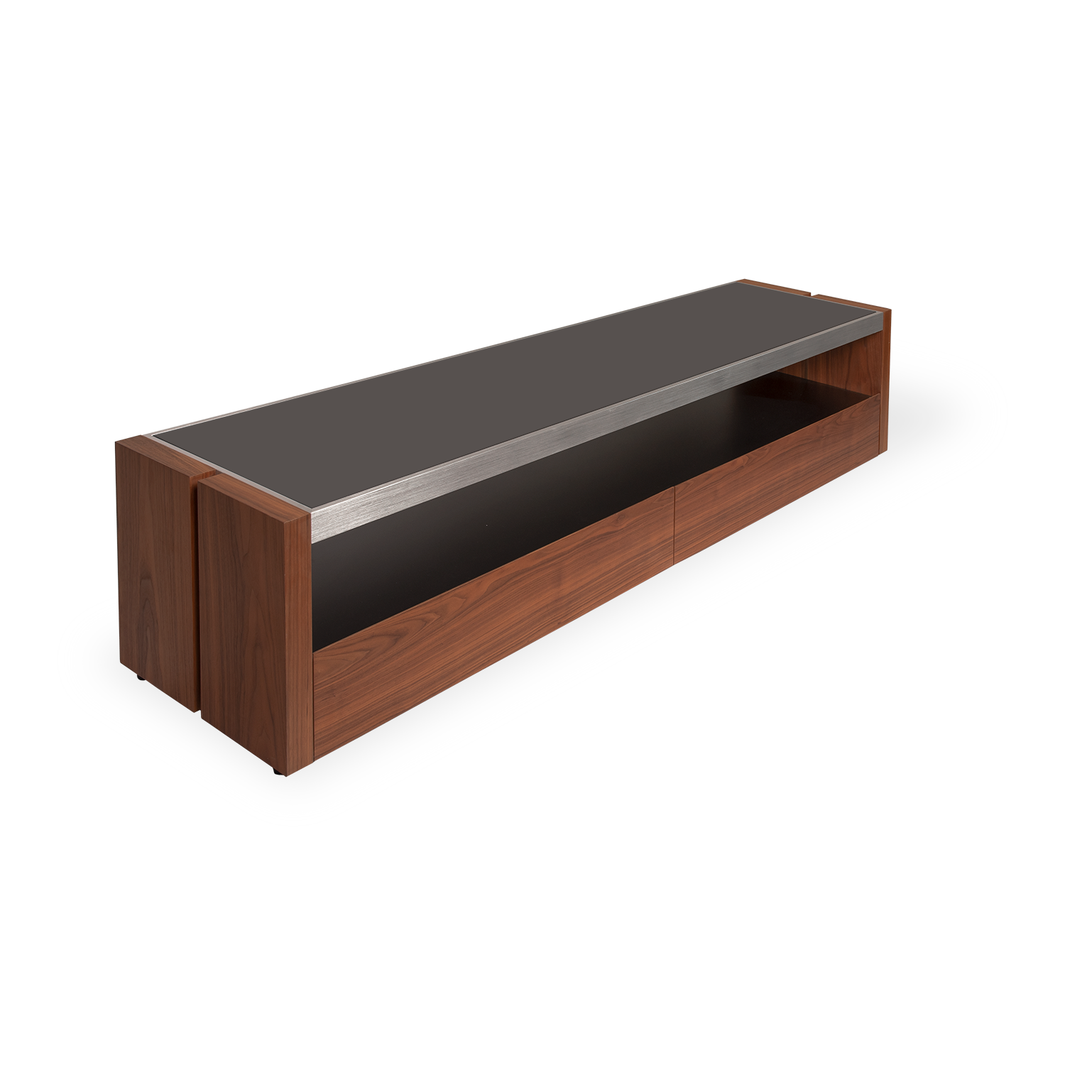 The Christa TV Unit has a minimalist, traditonal design, with a long, sleek form and an eye-catching combination of textures. A black tempered glass top provides a stark contrast against the walnut veneer base, and a linear chrome strip surrounds the tabletop. Two spacious drawers provide ample storage space.