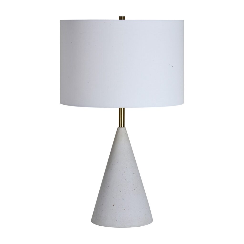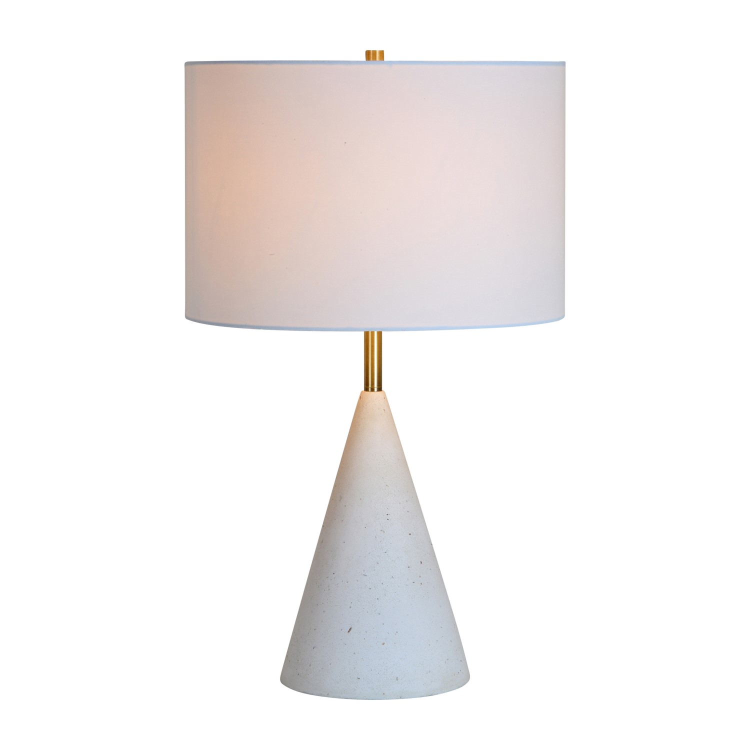 [0] => The Cinema Table Lamp, designed by Jennifer Attie, will bring a clean and modern look to your living space. Its distinctive conical base is made of white speckled terrazzo that supports an antique brushed iron neck with a brass finish. A white cotton lampshade and three-way switch add the finishing touches to this lamp that blends simplicity and substance.