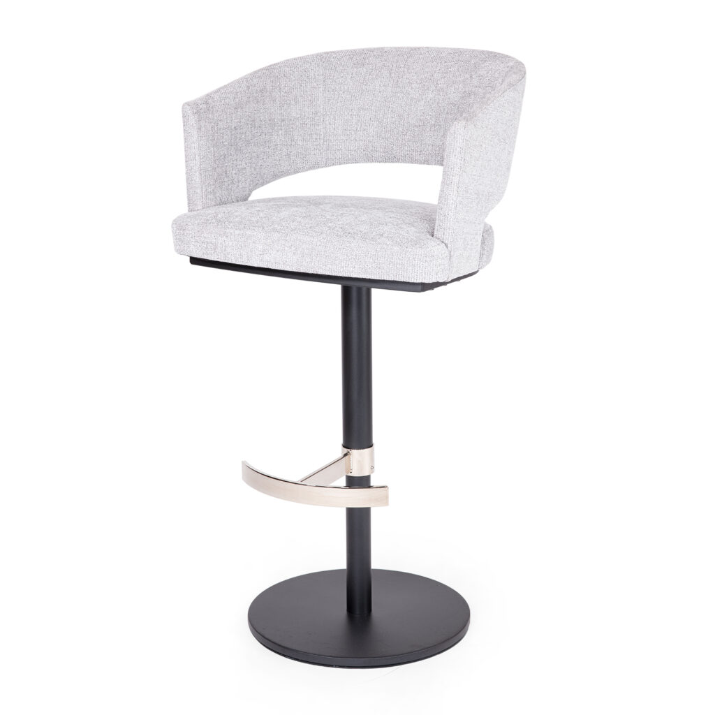[0] => The Circa Barstool is sophisticated and contemporary, featuring rounded, clean lines and a wraparound back with a crescent-shaped cutout. A carbon black height-adjustable pedestal base supports a plush, comfortable seat upholstered in woven sleet fabric with variegated tones of grey, white, and silver. The footrest in white and silver adds extra support and a touch of contrast against the black base.