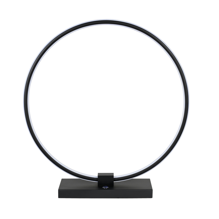 [0] => The Circo table lamp is sleek and minimalist with an eye-catching, ring-shaped frame illuminated by bright LEDs. Circo has three brightness settings adjusted via a button on the base and brings simple yet sophisticated design to your living space. The LEDs are 17.5W.