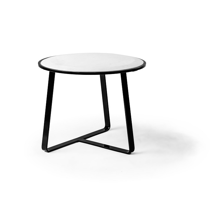 [0] => The Circolo Side Table, available in white carrara marble, has a sleek, sophisticated design, with a linear black frame that complements the circular tabletop. Three legs meld in the center to form the frame, and the marble top slightly tapers downward at the edges, creating a subtle dome-like shape.