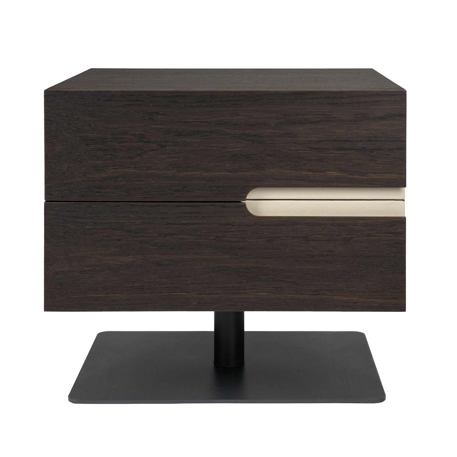 [0] => The Ciro Nightstand, made in Italy and available in a left configuration, has a sleek, minimalist design, with a burned oak frame, soft leather inserts, and a graphite base. The handles are smoothly carved to allow the cream leather to stand out, creating a sublte style accent and compelling contrast, while two drawers provide ample storage space. This piece adds a chic touch to your bedroom.