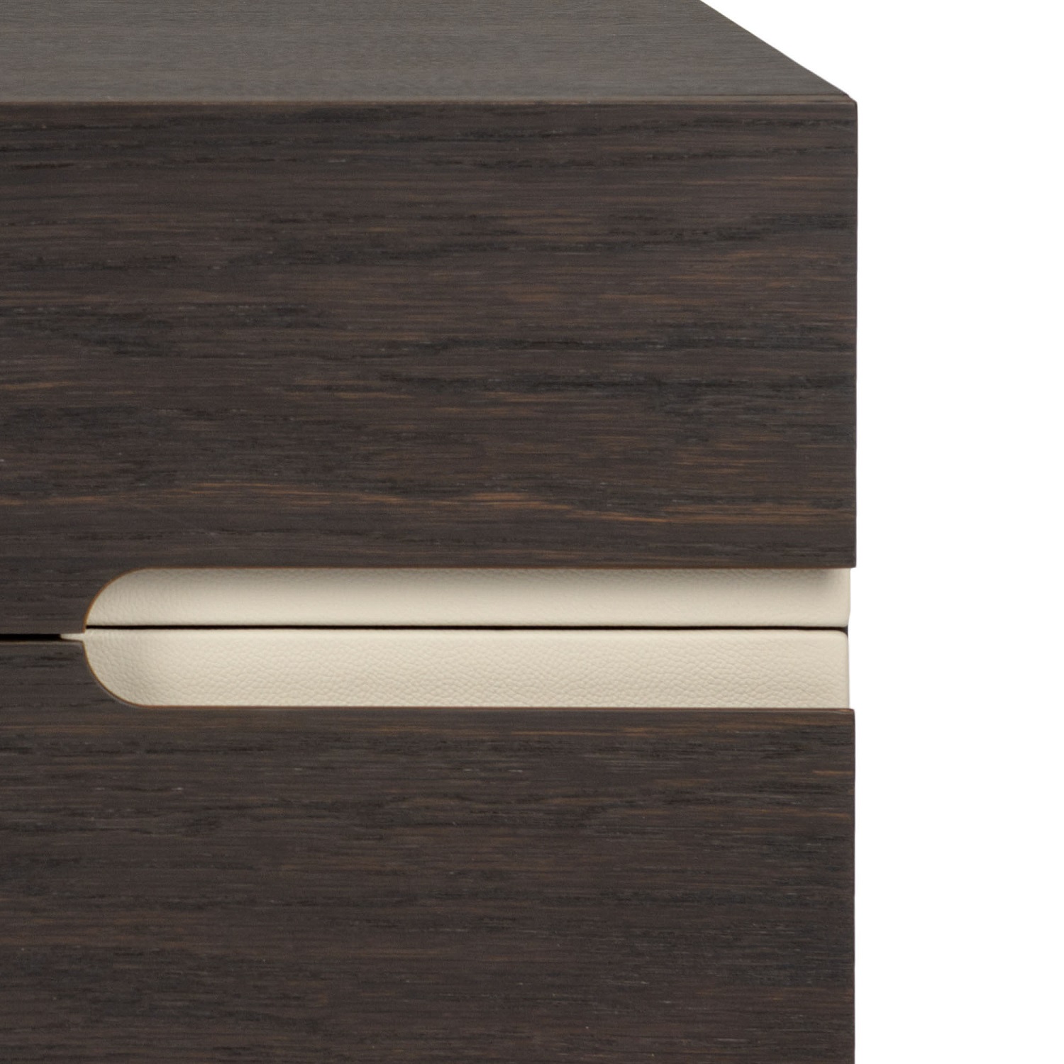 The Ciro Nightstand, made in Italy and available in a left configuration, has a sleek, minimalist design, with a burned oak frame, soft leather inserts, and a graphite base. The handles are smoothly carved to allow the cream leather to stand out, creating a sublte style accent and compelling contrast, while two drawers provide ample storage space. This piece adds a chic touch to your bedroom.