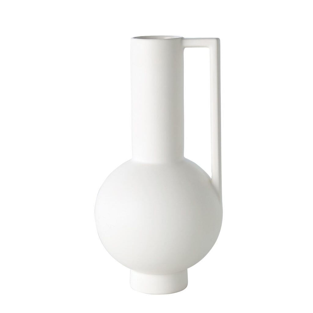 [0] => The Classic Pitcher with Handle, available in matte white, is made with a reactive glaze similar to that found on traditional Greco-Roman serveware. A harmonious intersection of clean geometric forms, this pitcher has a spherical body and a tall, cylindrical neck with a rectangular handle. Though not watertight or food-safe, this pitcher will add a timeless style accent wherever it is placed.