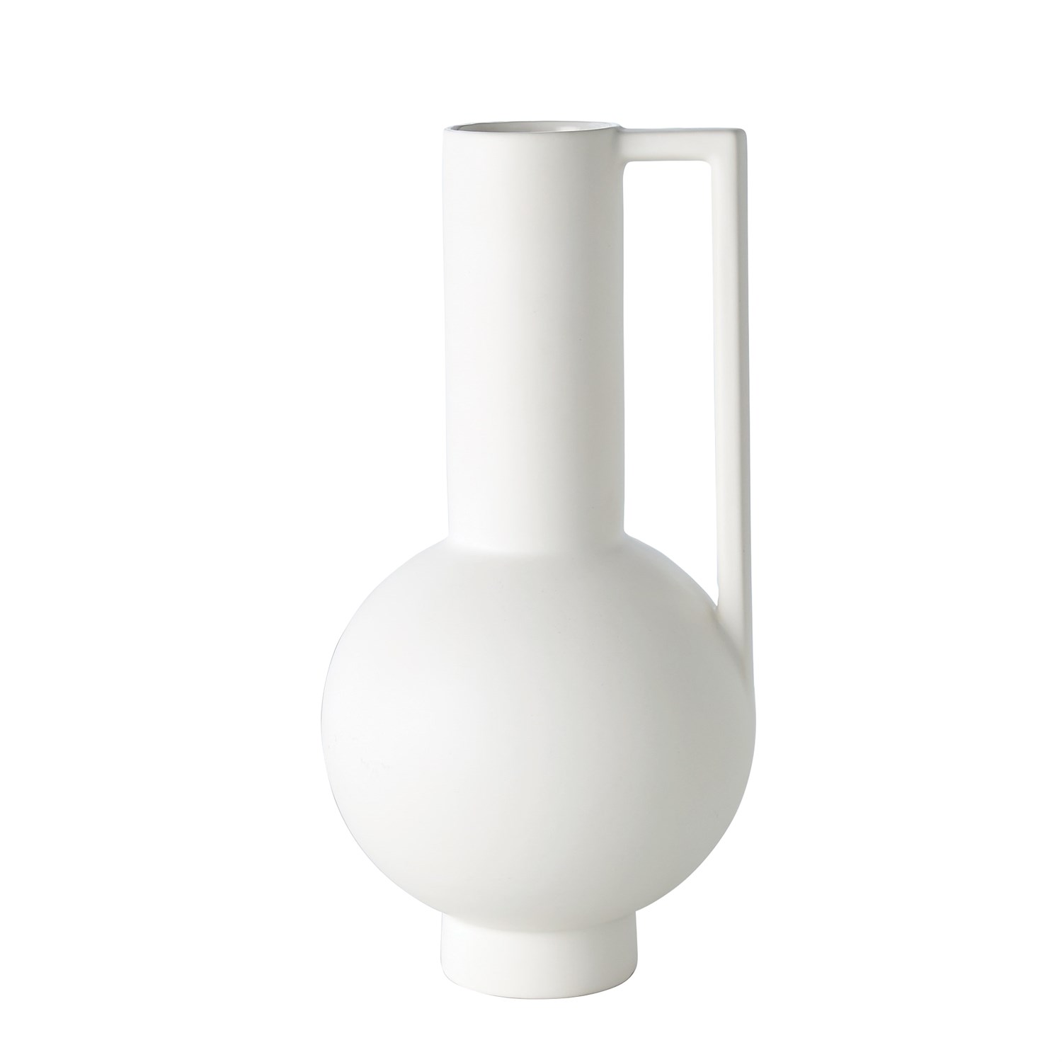 The Classic Pitcher with Handle, available in matte white, is made with a reactive glaze similar to that found on traditional Greco-Roman serveware. A harmonious intersection of clean geometric forms, this pitcher has a spherical body and a tall, cylindrical neck with a rectangular handle. Though not watertight or food-safe, this pitcher will add a timeless style accent wherever it is placed.
