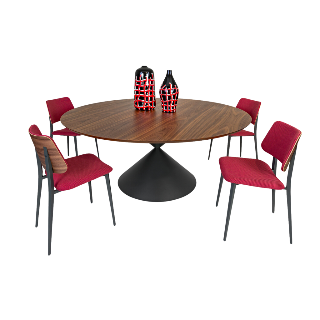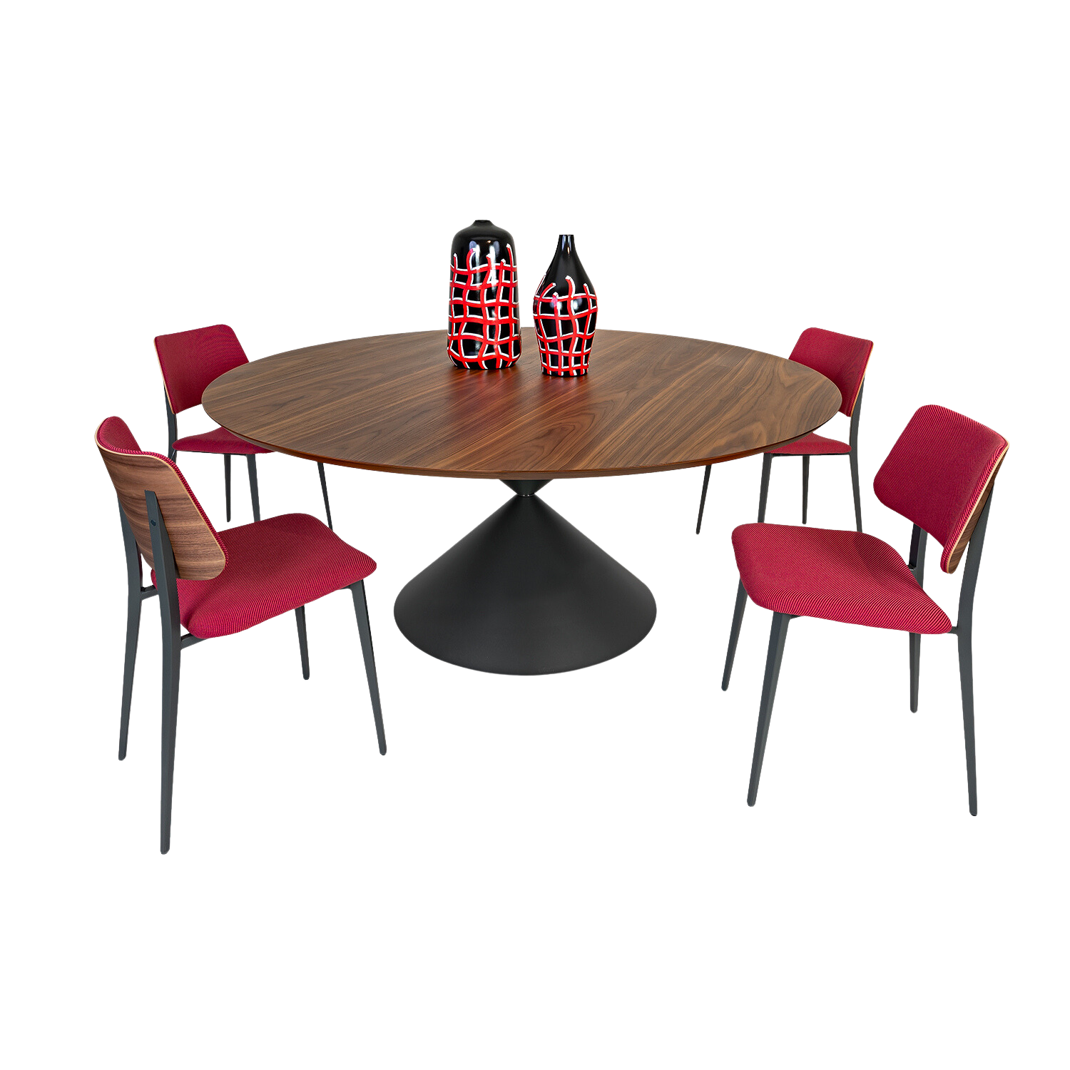 [0] => The Clessidra Round Dining Table is a feat of geometry, with its circular top that appears to balance gracefully on an hourglass base. Featuring a walnut veneer with an elegant grain, Clessidra's tabletop rests securely on a graphite metal base with a black nickel ring at its narrowest point. The embodiment of sophistication, drama, and subtle strength, Clessidra is nothing less than functional art for your modern dining room.