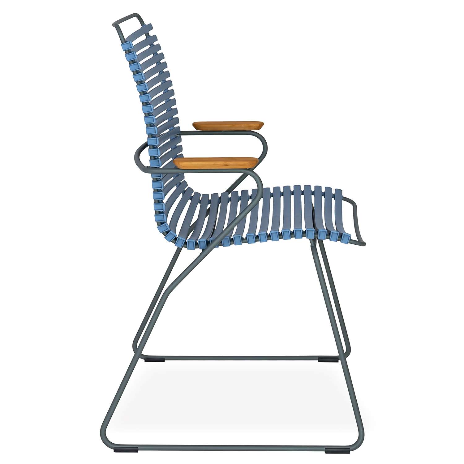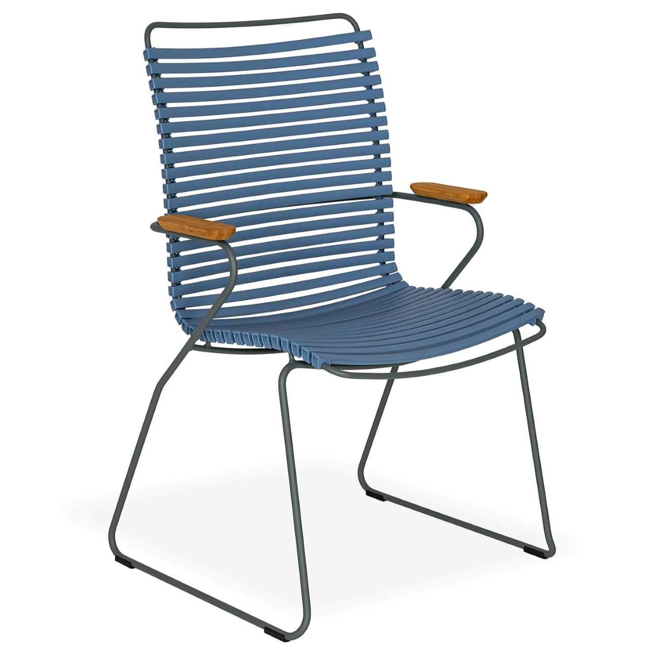 [0] => The Click High Back Dining Armchair has a striking, ergonomic design that provides sturdy and stylish cushion-free comfort by the pool or dining table. Made with UV-protected plastic lamellas, Click is suitable for use indoors and out and features a grey, powder-coated steel frame. Bamboo armrests add a touch of warmth and texture to the slatted blue seat and grey frame, which appears to form the chair's structure in one fluid motion. Click's plastic lamellas can be clicked on and off to be replaced or to modify its look, taking Danish modern design to the next level.