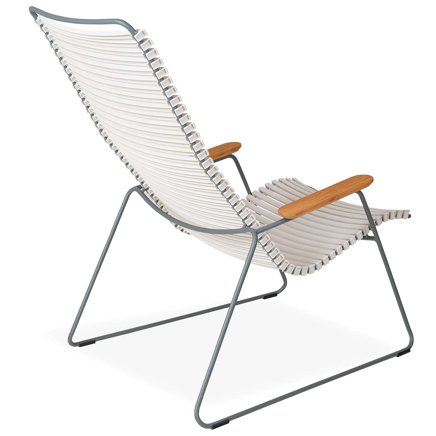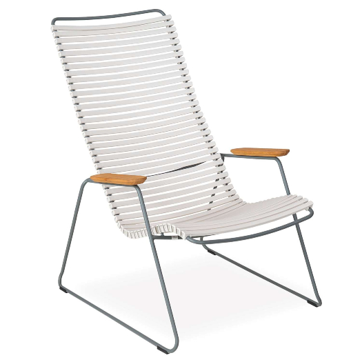 Embrace outdoor relaxation with the Click Lounge Chair, designed in Denmark. Click features a striking, ergonomic form that provides sturdy and stylish cushion-free comfort by the pool, on the patio, or in the living room. Suitable for use indoors and out, Click is made with UV-protected plastic lamellas (slats) in muted white, supported by a grey powder-coated steel frame. Bamboo armrests add a touch of intrigue and texture to the slatted body and metal frame, which appear to form the chair's structure in one fluid motion. The plastic lamellas can be clicked on and off to be replaced or to modify its look, taking Danish modern design to the next level.