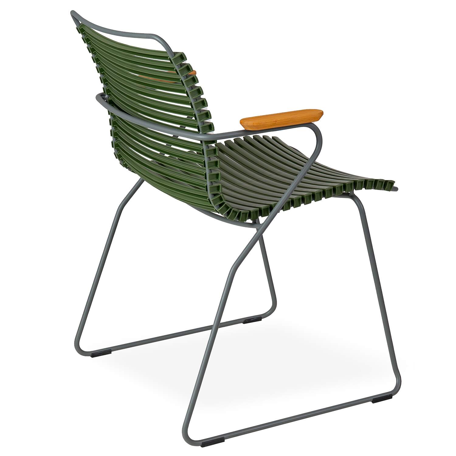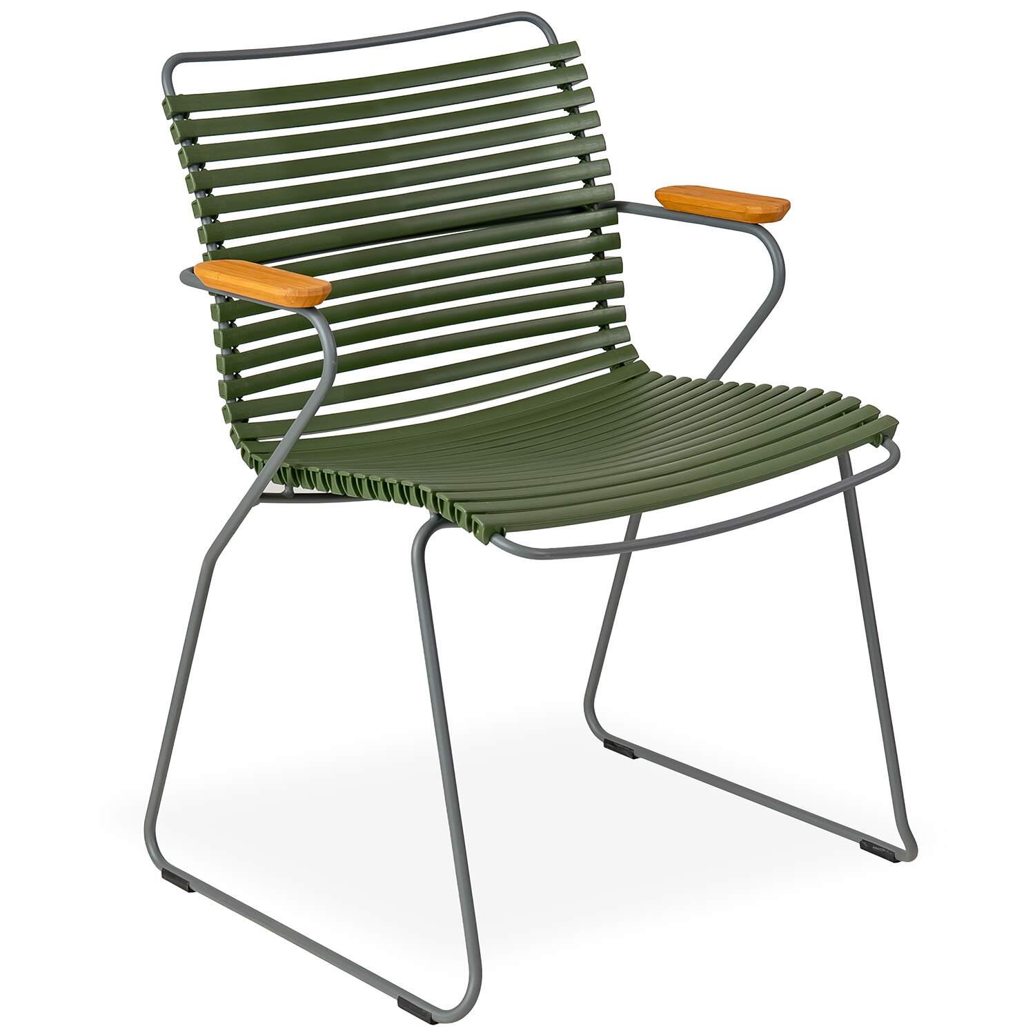 The Click Low Back Dining Armchair has a striking, ergonomic design that provides sturdy and stylish cushion-free comfort by the pool or dining table. Made with UV-protected plastic lamellas (slats), Click is suitable for use indoors and out and features a grey, powder-coated steel frame. Bamboo armrests add a touch of intrigue and texture to the slatted olive green seat and grey frame, which appear to form the chair's structure in one fluid motion. Click's plastic lamellas can be clicked on and off to be replaced or to modify its look, taking Danish modern design to the next level.