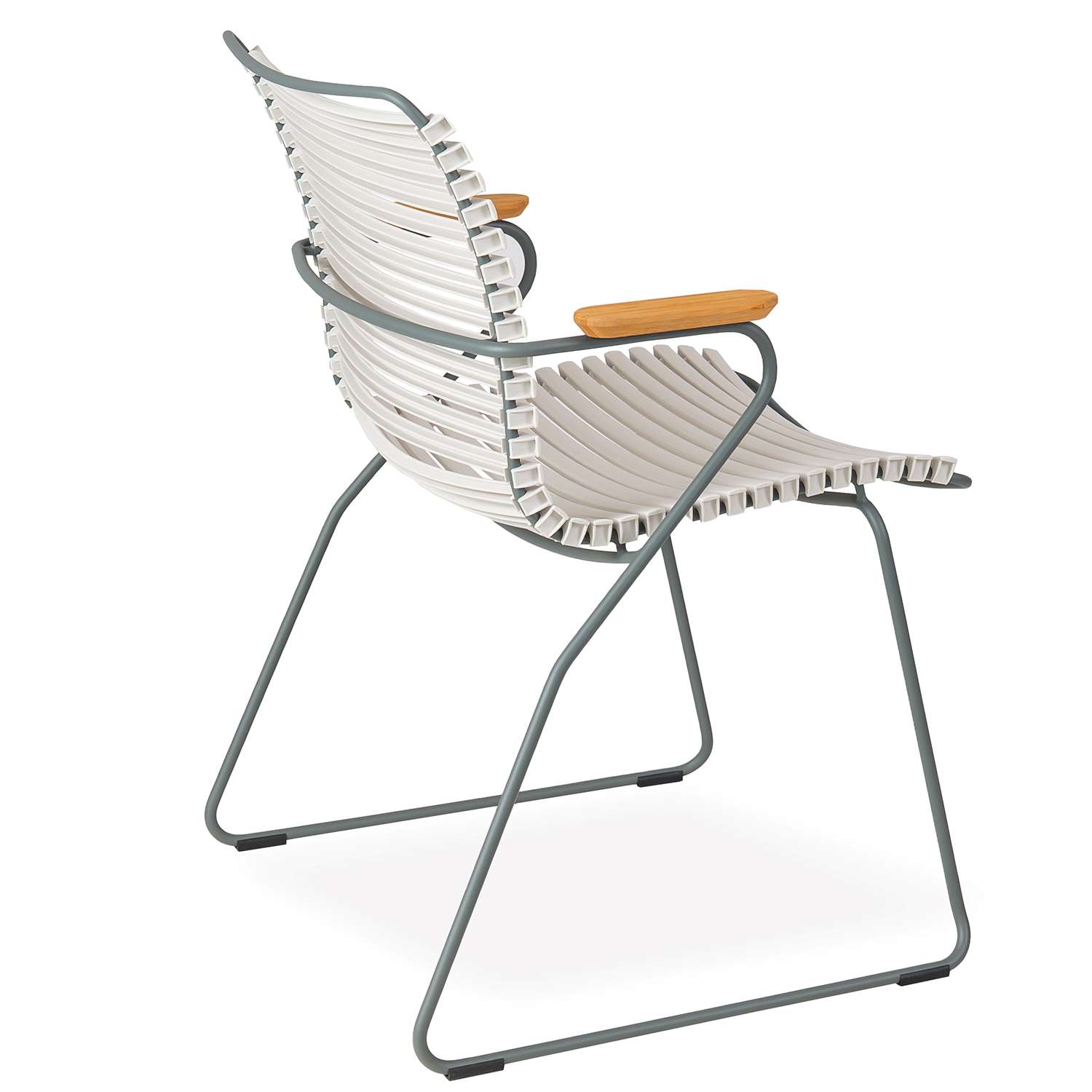 The Click Low Back Dining Armchair has a striking, ergonomic design that provides sturdy and stylish cushion-free comfort by the pool or dining table. Made with UV-protected plastic lamellas (slats), Click is suitable for use indoors and out and features a grey, powder-coated steel frame. Bamboo armrests add a touch of intrigue and texture to the slatted off-white seat and grey frame, which appear to form the chair's structure in one fluid motion. Click's plastic lamellas can be clicked on and off to be replaced or to modify its look, taking Danish modern design to the next level.