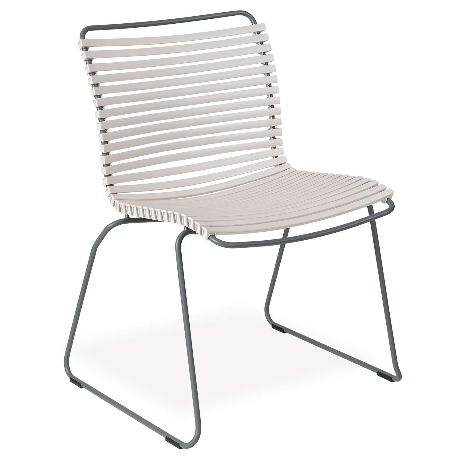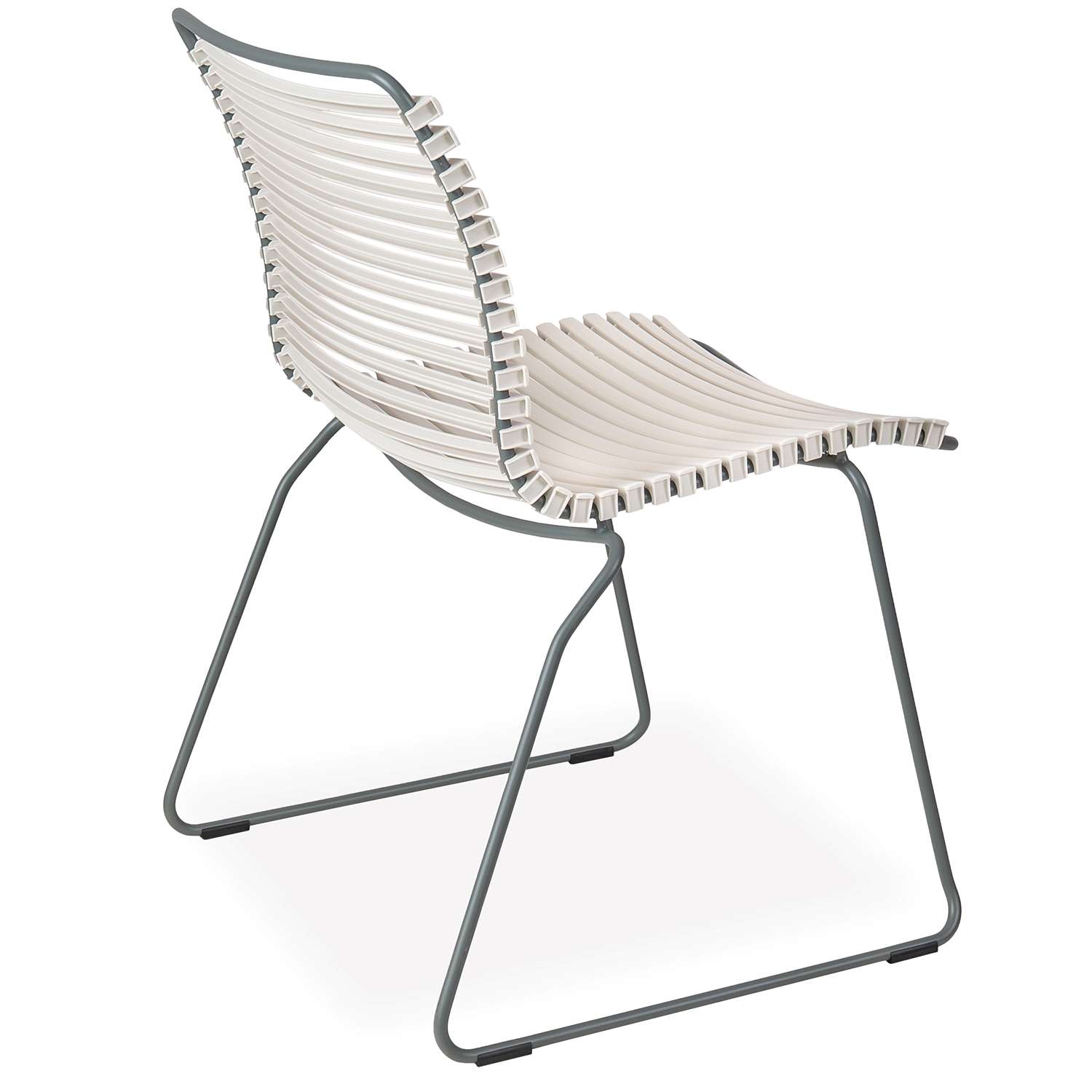 The Click Low Back Dining Chair has a striking, ergonomic design that provides sturdy and stylish cushion-free comfort by the pool or dining table. Suitable for use indoors and out, Click is made with UV-protected plastic lamellas (slats) in muted white, supported by a grey powder-coated steel frame. Click's plastic lamellas can be clicked on and off to be replaced or to modify its look, taking Danish modern design to the next level.