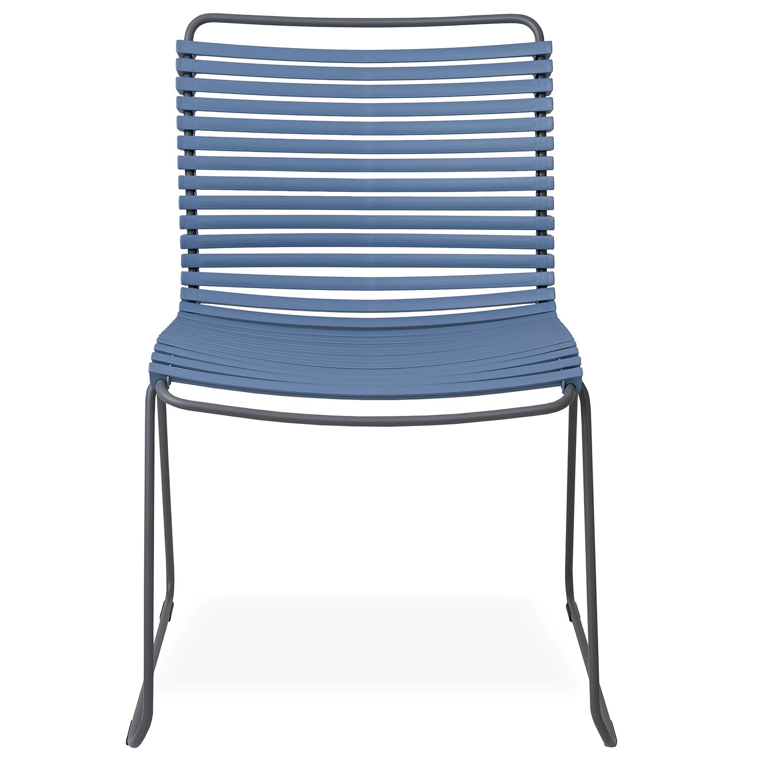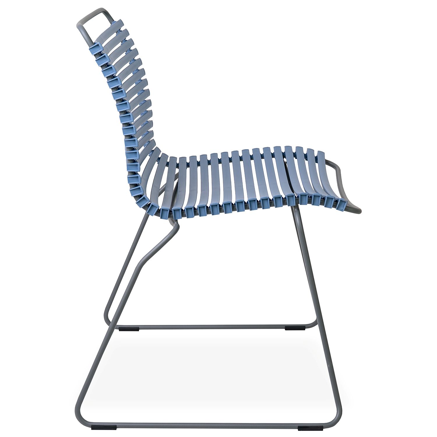 The Click Low Back Dining Chair has a striking, ergonomic design that provides sturdy and stylish cushion-free comfort by the pool or dining table. Suitable for use indoors and out, Click is made with UV-protected plastic lamellas (slats) in pigeon blue, supported by a grey powder-coated steel frame. Click's plastic lamellas can be clicked on and off to be replaced or to modify its look, taking Danish modern design to the next level.
