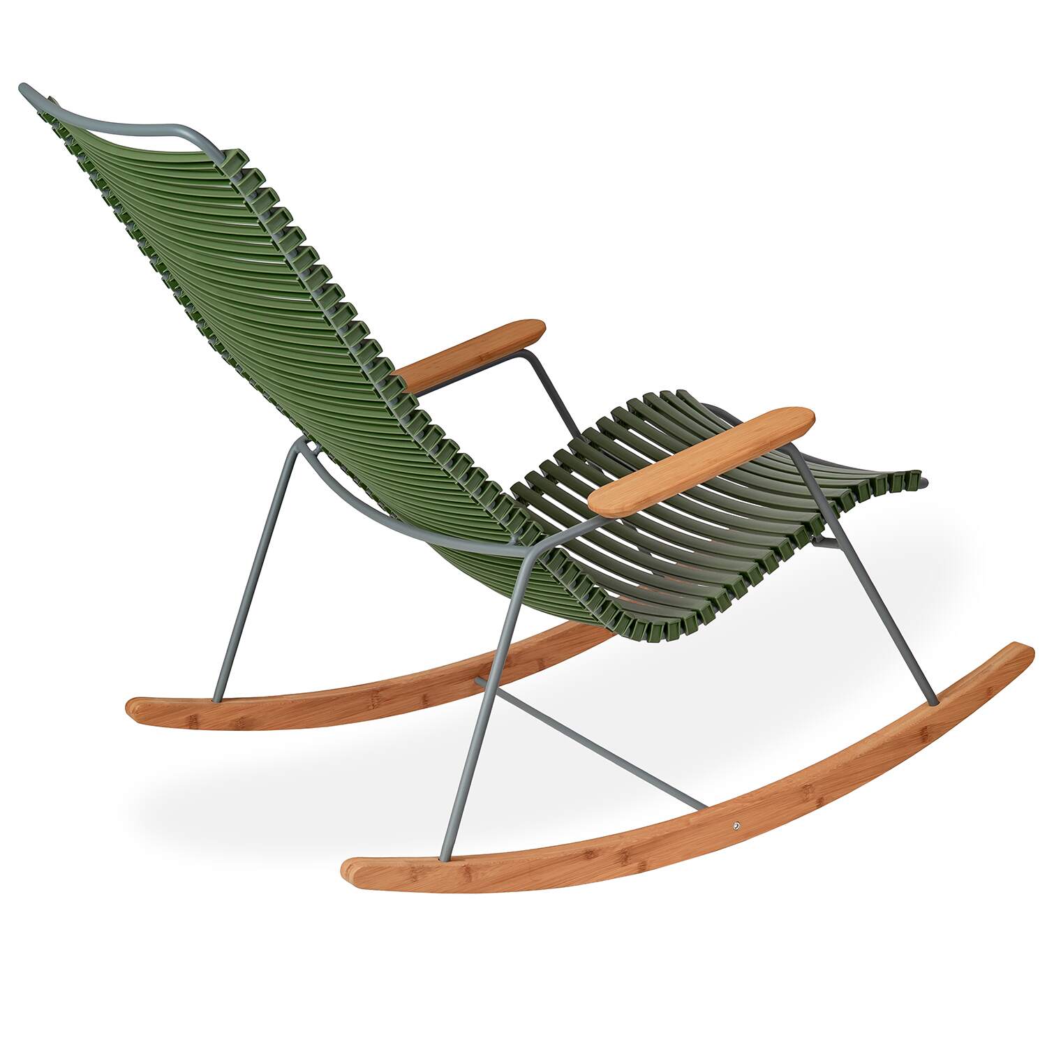 Embrace outdoor relaxation with the Click Rocking Chair, designed in Denmark. Click features a striking, ergonomic form that provides sturdy and stylish cushion-free comfort by the pool, on the patio, or in the living room. Suitable for use indoors and out, Click is made with UV-protected plastic lamellas (slats) in chic olive green, supported by a grey powder-coated steel frame. Bamboo armrests and rockers add a touch of intrigue and texture to the slatted body and metal frame, which appear to form the chair's structure in one fluid motion. The plastic lamellas can be clicked on and off to be replaced or to modify its look, taking Danish modern design to the next level.